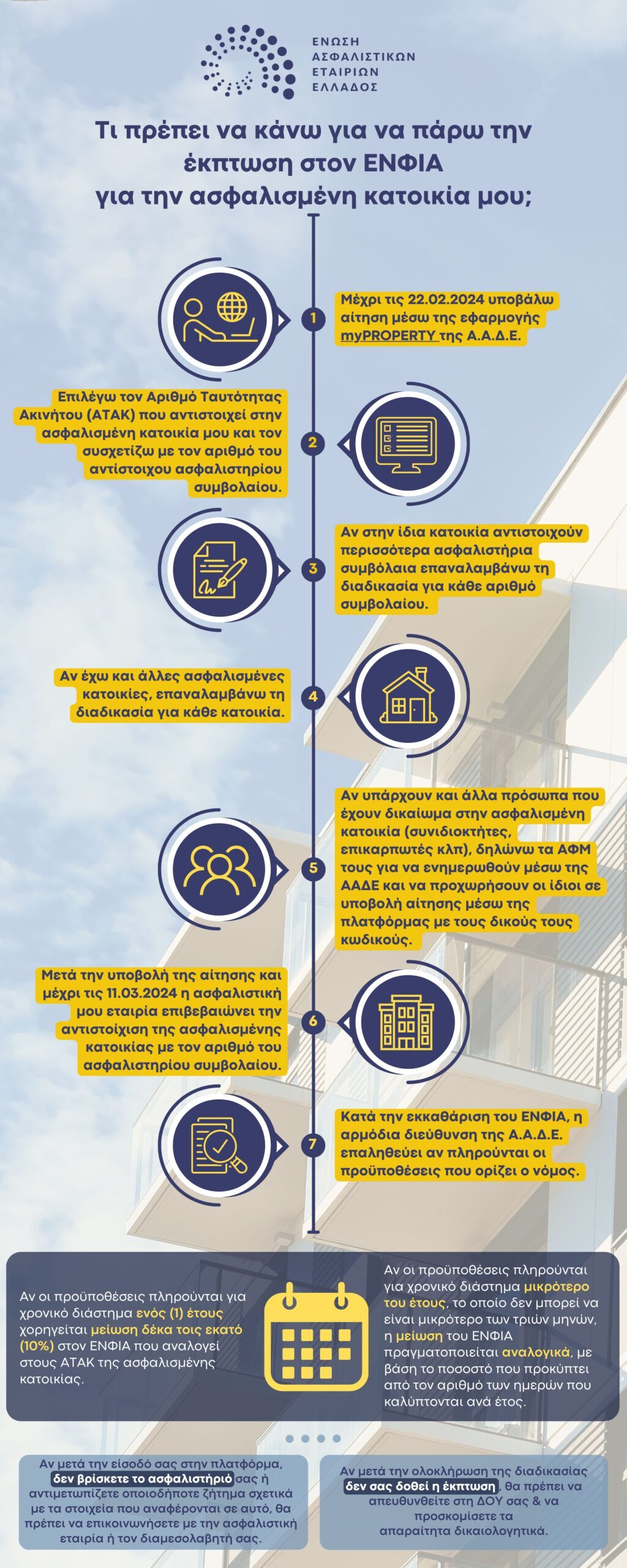 Όπως αναφέρεται σε ανακοίνωση, σε συνέχεια δημοσίευσης του Νόμου 5045/2023 (ΦΕΚ Α’ 136/29.7.2023) και της εφαρμοστικής ΚΥΑ 1014/2024 (ΦΕΚ Β΄743/31.1.2024) για τη μείωση ΕΝΦΙΑ για τις ασφαλισμένες κατοικίες, η Ένωση Ασφαλιστικών Εταιριών Ελλάδος ενημερώνει ποια είναι τα βήματα που πρέπει να ακολουθήσει ο πολίτης προκειμένου να πάρει την έκπτωση.