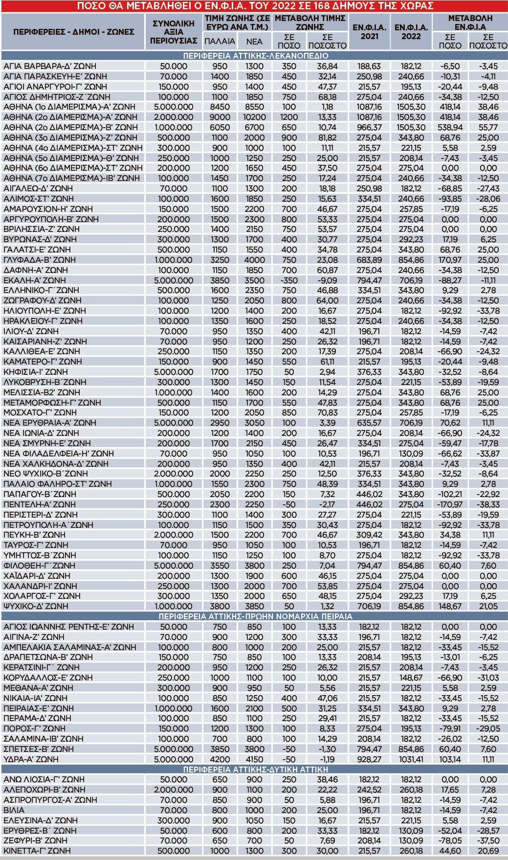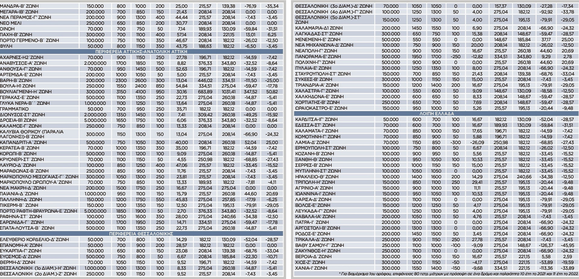 * αυξάνεται από 11,3 σε 13,4 ευρώ ανά τ.μ. για τιμές ζώνης από 4.501 έως 5.000 ευρώ και από 13 σε 16,2 ευρώ ανά τ.μ. για τιμές ζώνης μεγαλύτερες των 5.000 ευρώ ανά τ.μ.