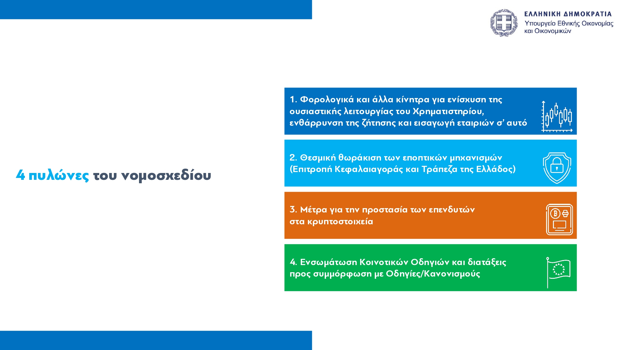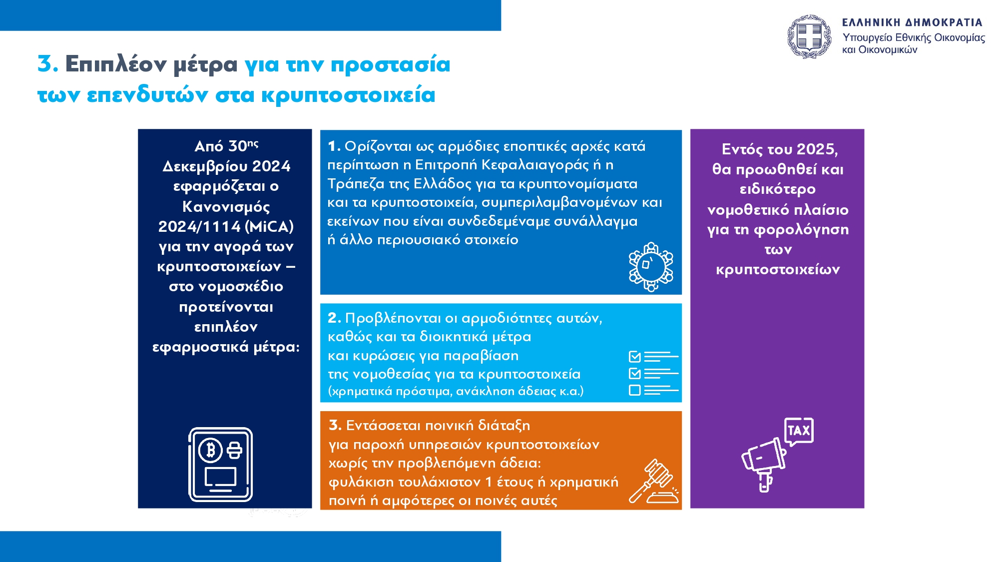 Σε συνέχεια των ρυθμίσεων του Ευρωπαϊκού Κανονισμού 2024/1114 για τις αγορές κρυπτοστοιχείων, που τέθηκε ήδη σε ισχύ στις 30 Δεκεμβρίου 2024, το σχέδιο νόμου προβλέπει επιπλέον ρυθμίσεις όπως: