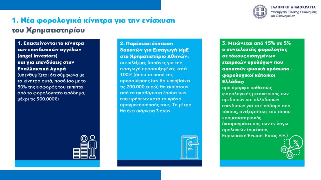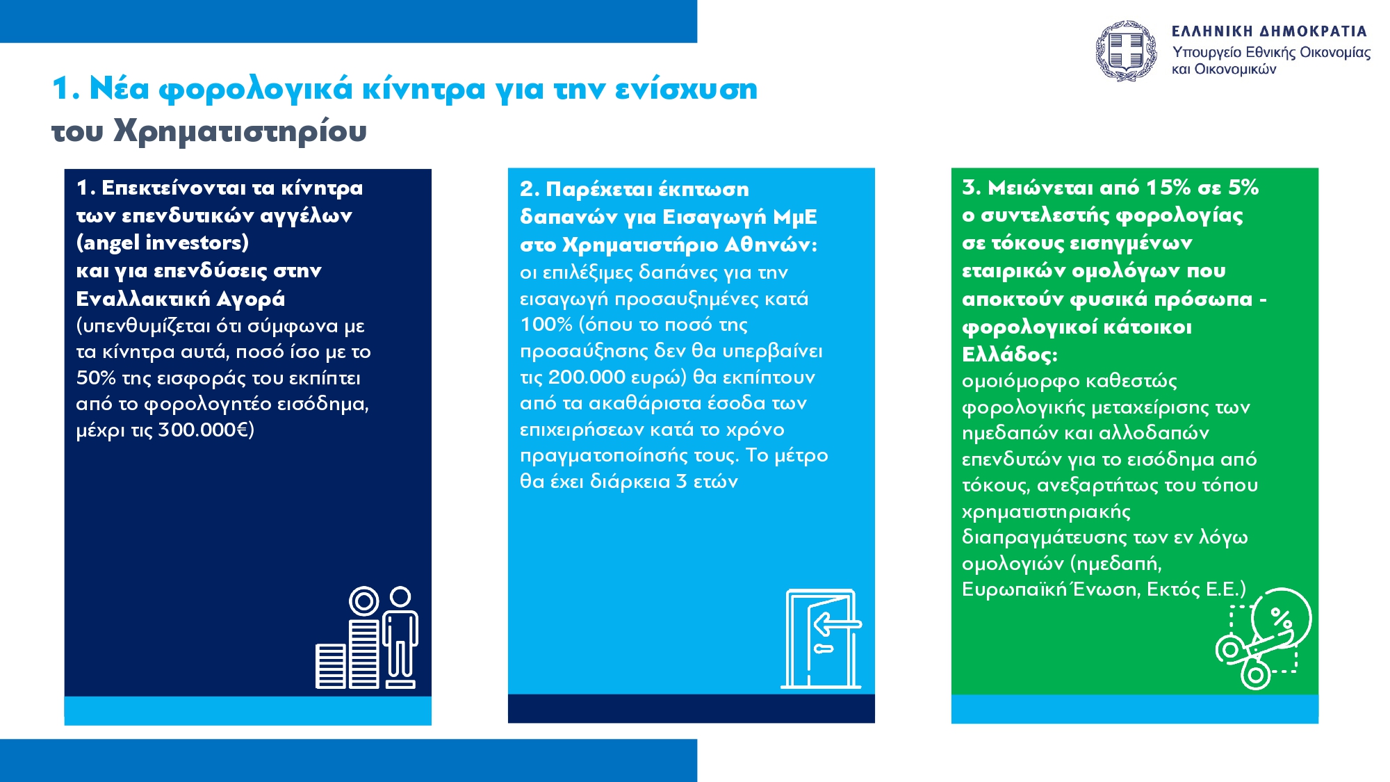 - Επεκτείνονται τα κίνητρα που ισχύουν για τους επενδυτικούς αγγέλους (angel investors) και για επενδύσεις στην Εναλλακτική Αγορά. Σύμφωνα με τα κίνητρα αυτά, ποσό ίσο με το 50% της εισφοράς τους εκπίπτει από το φορολογητέο εισόδημα, μέχρι τις 300.000€).