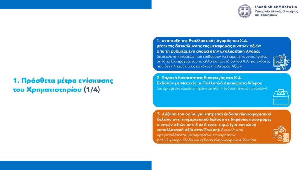 - Θεσπίζεται η δυνατότητα εισαγωγής στο Χρηματιστήριο, μετοχών με Πολλαπλά Δικαιώματα Ψήφου, όπως ισχύει ήδη σε ορισμένες χώρες. Σήμερα πολλοί ιδιοκτήτες εταιρειών αποφεύγουν να εισάγουν τις μετοχές της εταιρείας τους στο Χρηματιστήριο, επειδή φοβούνται ότι θα χάσουν τον έλεγχό της. Οι μετοχές με πολλαπλά δικαιώματα ψήφου, επιτρέπουν στους ιδρυτές των υπό εισαγωγή εταιρειών να έχουν περισσότερες ψήφους ανά μετοχή από ό,τι οι νέοι επενδυτές, διατηρώντας έτσι τον έλεγχο.