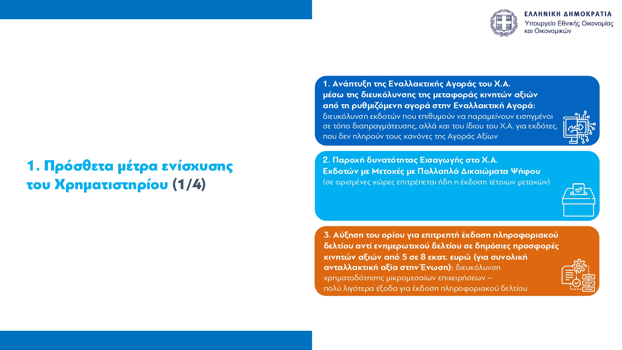 - Διευκολύνεται η μεταφορά κινητών αξιών από τη Αγορά Αξιών του Χ.Α. στην Εναλλακτική Αγορά του Χ.Α. Στόχος είναι η ανάπτυξη της Εναλλακτικής Αγοράς (ΕΝ.Α.) και η διευκόλυνση αφενός των επιχειρήσεων που θέλουν να παραμείνουν εισηγμένες αλλά δεν πληρούν τους κανόνες της Αγοράς Αξιών και αφετέρου του ίδιου του Χρηματιστηρίου προκειμένου να μεταφέρει εταιρείες που δεν πληρούν τους κανόνες της Αγοράς Αξιών αλλά μπορούν να ακολουθήσουν τους κανόνες της ΕΝ.Α..