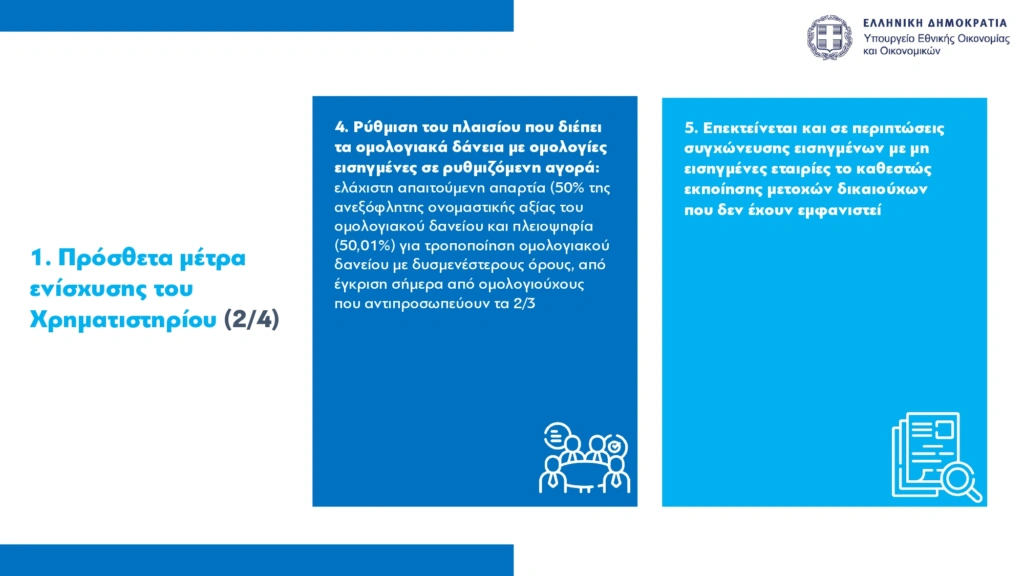 - Ρυθμίζεται το πλαίσιο που διέπει τα ομολογιακά δάνεια με ομολογίες εισηγμένες σε ρυθμιζόμενη αγορά. Η υφιστάμενη νομοθεσία, προβλέπει ότι για την τροποποίηση ομολογιακού δανείου με όρους που είναι δυσμενέστεροι των αρχικών όρων για τους ομολογιούχους απαιτείται η έγκριση από ομολογιούχους που αντιπροσωπεύουν τα δύο τρίτα (2/3). Αυτό καθιστά πολύ δύσκολη τη λήψη αποφάσεων από τη συνέλευση των ομολογιούχων, κάτι που τελικά μπορεί να λειτουργήσει εις βάρος και των εκδοτριών αλλά και των ομολογιούχων. Έτσι, εισάγεται ελάχιστη απαιτούμενη απαρτία (50% της ανεξόφλητης ονομαστικής αξίας του ομολογιακού δανείου) και πλειοψηφία (50,01%).