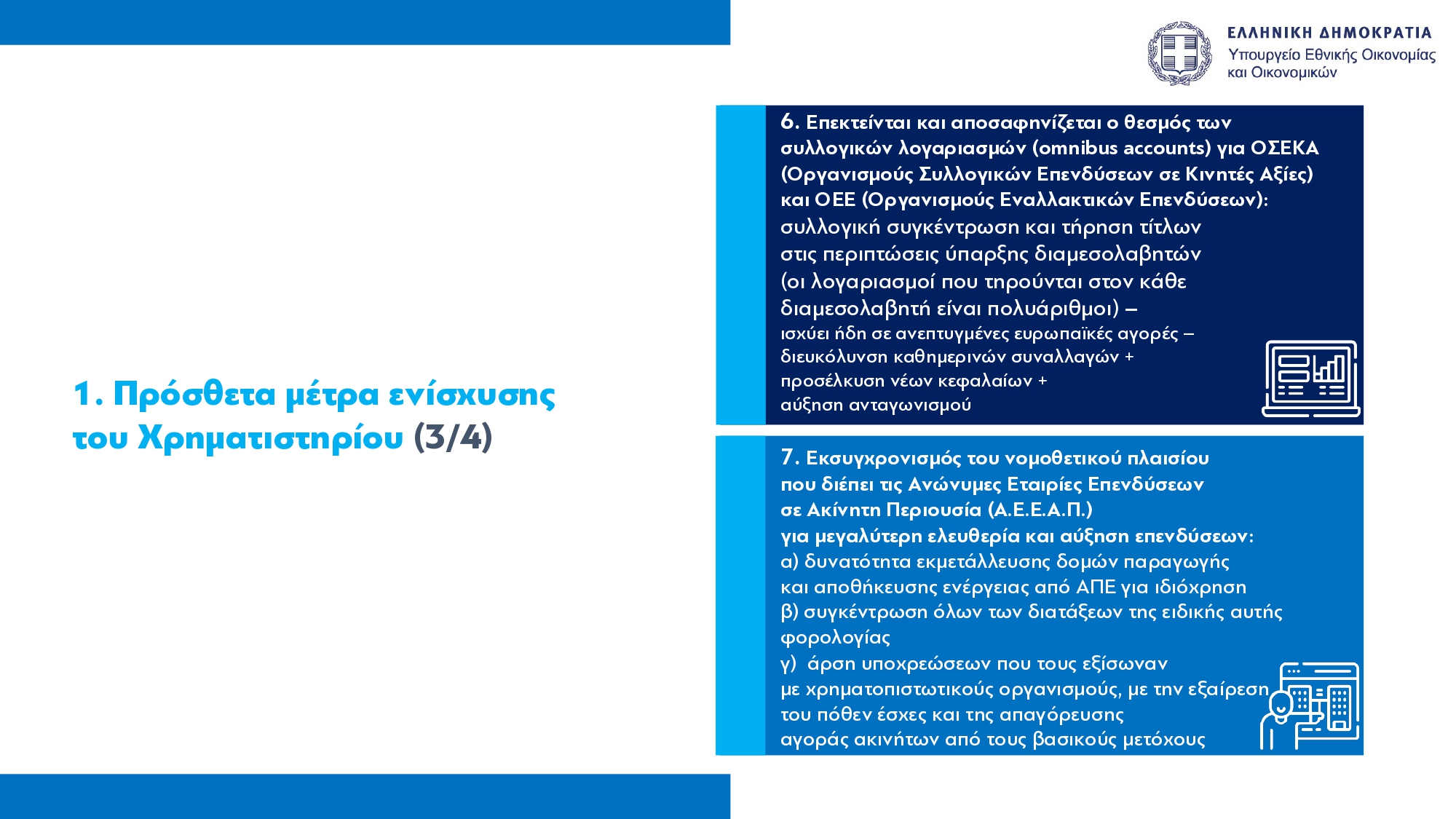 - Επεκτείνεται και αποσαφηνίζεται ο θεσμός των συλλογικών λογαριασμών (omnibus accounts) για ΟΣΕΚΑ (Οργανισμούς Συλλογικών Επενδύσεων σε Κινητές Αξίες) και ΟΕΕ (Οργανισμούς Εναλλακτικών Επενδύσεων), όπως ισχύει ήδη σε ανεπτυγμένες ευρωπαϊκές αγορές. Προβλέπεται η συλλογική συγκέντρωση και τήρηση τίτλων στις περιπτώσεις ύπαρξης διαμεσολαβητών. Στόχος είναι η διευκόλυνση των συναλλαγών, η προσέλκυση νέων κεφαλαίων και η μείωση του κόστους (προμήθειες κλπ.) για τους επενδυτές μέσω της ενίσχυσης του ανταγωνισμού. Επισημαίνεται ακόμη ότι η έλλειψη νομοθετικού πλαισίου στην Ελλάδα σήμερα δημιουργεί έντονα προβλήματα στις ελληνικές Εταιρείες Διαχείρισης Αμοιβαίων Κεφαλαίων (Α.Ε.Δ.Α.Κ.) και Ανώνυμες Εταιρίες Διαχείρισης Οργανισμών Εναλλακτικών Επενδύσεων (Α.Ε.Δ.Ο.Ε.Ε.) ως προς την συνεργασία τους με ξένους θεματοφύλακες.