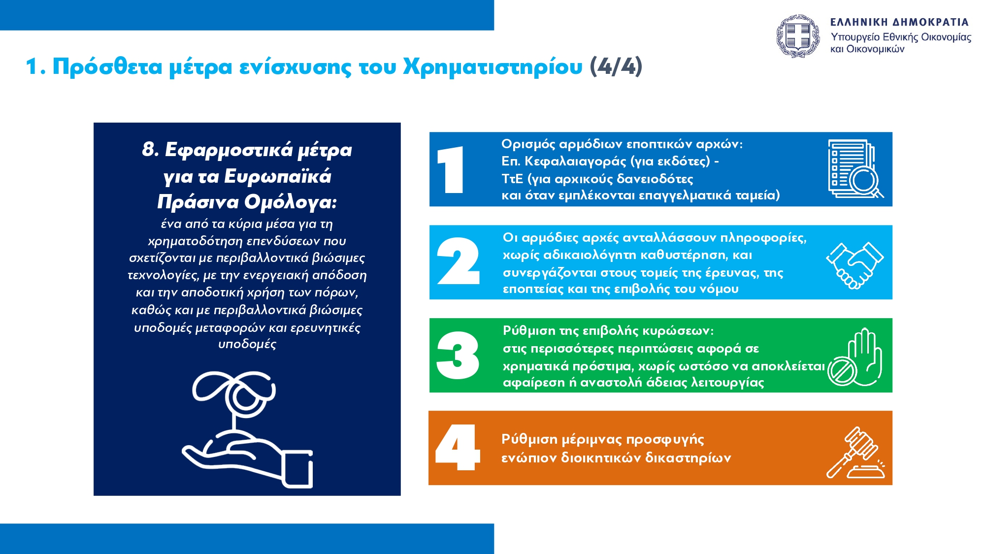 - Ρυθμίζεται το πλαίσιο έκδοσης «Ευρωπαϊκών Πράσινων Ομολόγων» (eu green bonds) για τη χρηματοδότηση περιβαλλοντικά βιώσιμων επενδύσεων π.χ. στην παραγωγή, εξοικονόμηση και διακίνηση ενέργειας. Συγκεκριμένα θεσπίζονται δικλείδες και μηχανισμοί ελέγχου – εποπτείας κατά περίπτωση από την Επιτροπή Κεφαλαιαγοράς και την Τράπεζα της Ελλάδος προκειμένου – μεταξύ άλλων – να διασφαλίζεται ότι τα έσοδα από τις εκδόσεις αυτές θα διατίθενται πράγματι σε δράσεις βιώσιμης ανάπτυξης. Προβλέπονται επίσης οι ποινές για τους παραβάτες που περιλαμβάνουν χρηματικά πρόστιμα, χωρίς ωστόσο να αποκλείεται αφαίρεση ή αναστολή άδειας λειτουργίας.