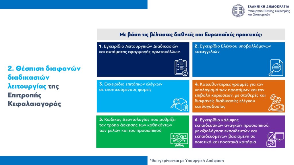 Θεσπίζονται διαφανείς διαδικασίες λειτουργίας της Επιτροπής Κεφαλαιαγοράς, με βάση τις βέλτιστες διεθνείς και ευρωπαϊκές πρακτικές. Συγκεκριμένα προβλέπεται να εκδοθούν: