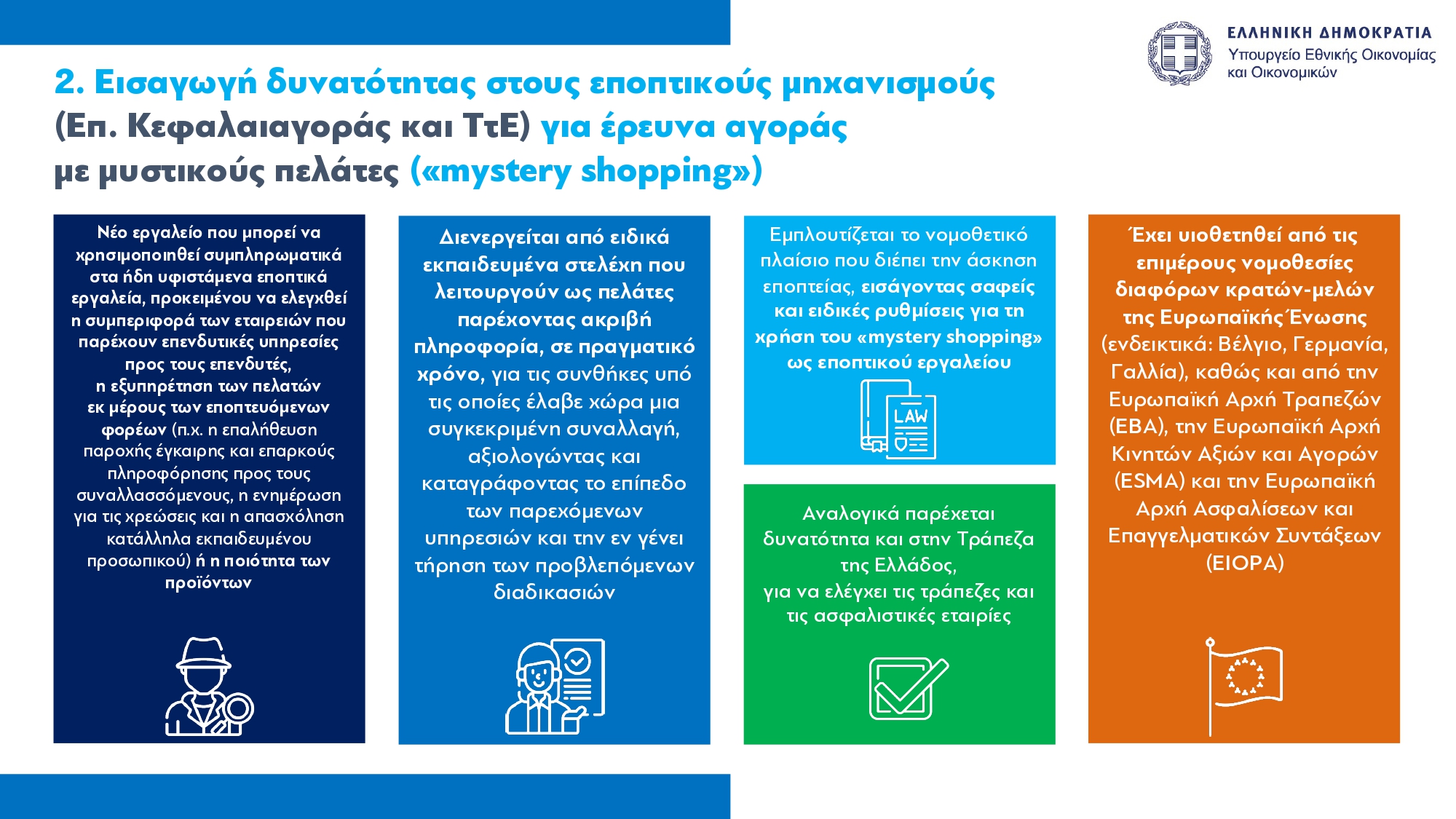 - Παρέχεται η δυνατότητα στους εποπτικούς μηχανισμούς (Επιτροπή Κεφαλαιαγοράς και Τράπεζα της Ελλάδος) να διενεργούν ελέγχους στους εποπτευόμενους φορείς με μυστικούς πελάτες («mystery shopping»). Στο πλαίσιο της διαδικασίας αυτής, που θα λειτουργεί συμπληρωματικά στα ήδη υπάρχοντα εποπτικά εργαλεία, ειδικά εκπαιδευμένα στελέχη της Επ. Κεφαλαιαγοράς και της ΤτΕ λειτουργώντας ως πελάτες θα ελέγχουν επιτόπου την συμπεριφορά των εταιρειών που παρέχουν επενδυτικές υπηρεσίες, των τραπεζών και των ασφαλιστικών εταιρειών ως προς την τήρηση της νομοθεσίας.