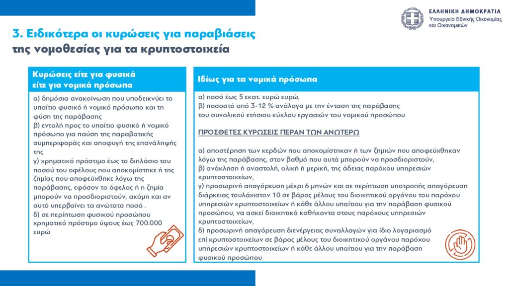 – Προβλέπονται οι αρμοδιότητες των εποπτικών αρχών, καθώς και τα διοικητικά μέτρα και κυρώσεις για παραβίαση της νομοθεσίας για τα κρυπτοστοιχεία (χρηματικά πρόστιμα, ανάκληση άδειας κ.α.). Ειδικότερα οι κυρώσεις είναι: