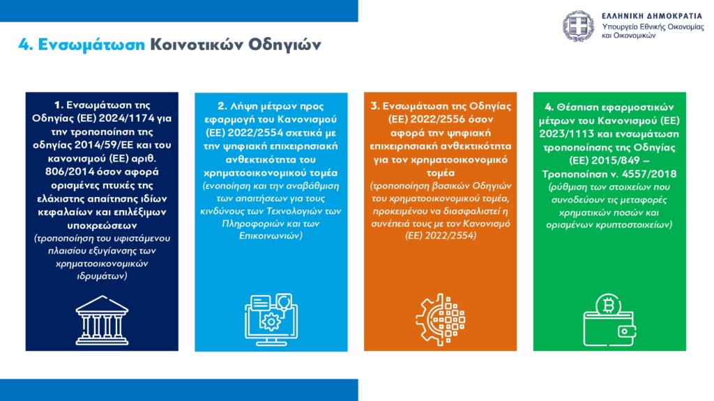 - Ενσωμάτωση της Οδηγίας (ΕΕ) 2024/1174 για την τροποποίηση της οδηγίας 2014/59/ΕΕ και του κανονισμού (ΕΕ) αριθ. 806/2014 όσον αφορά ορισμένες πτυχές της ελάχιστης απαίτησης ιδίων κεφαλαίων και επιλέξιμων υποχρεώσεων (τροποποίηση του υφιστάμενου πλαισίου εξυγίανσης των χρηματοοικονομικών ιδρυμάτων).
