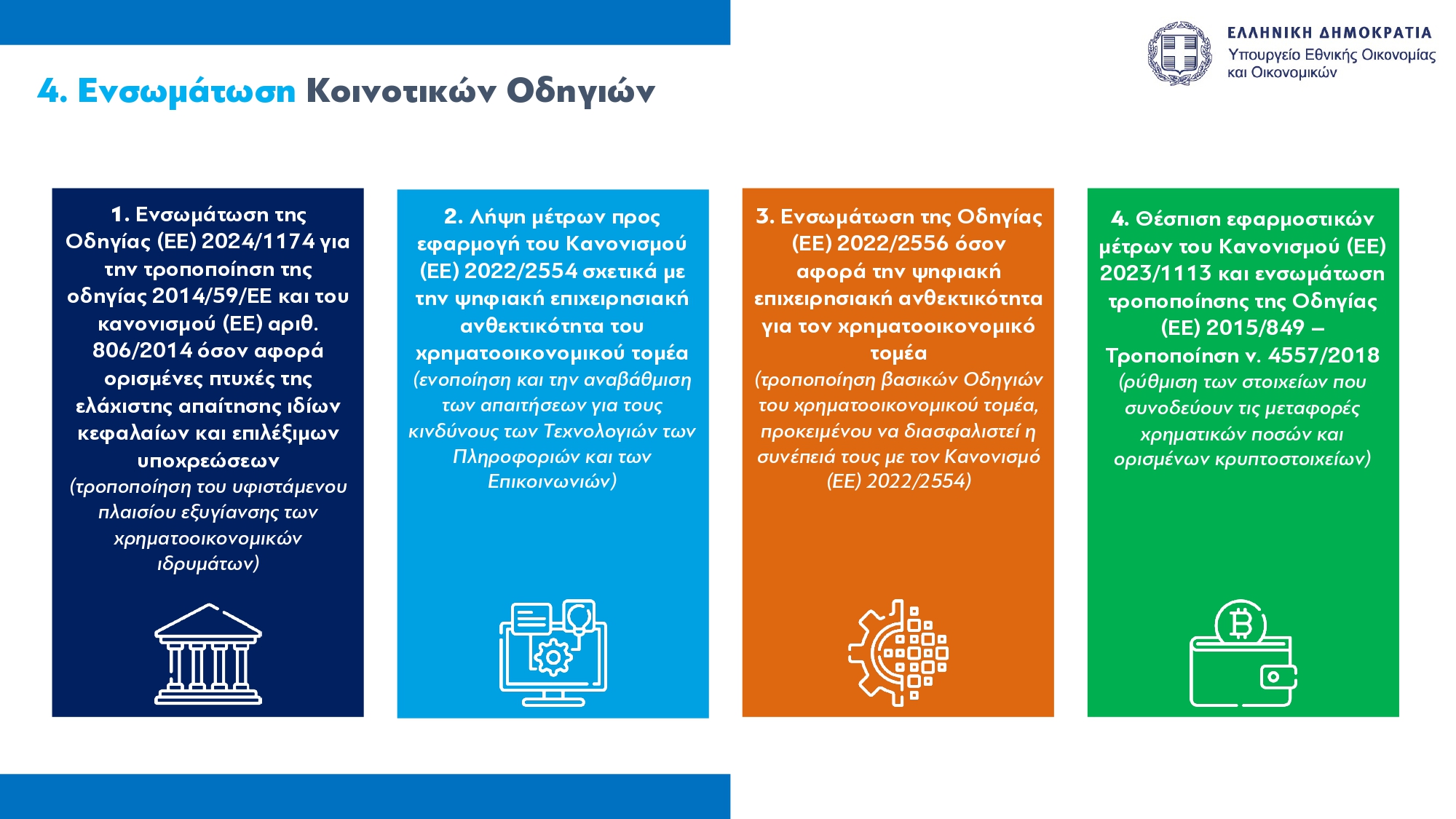 - Ενσωμάτωση της Οδηγίας (ΕΕ) 2022/2556 όσον αφορά την ψηφιακή επιχειρησιακή ανθεκτικότητα για τον χρηματοοικονομικό τομέα (τροποποίηση βασικών Οδηγιών του χρηματοοικονομικού τομέα, προκειμένου να διασφαλιστεί η συνέπειά τους με τον Κανονισμό (ΕΕ) 2022/2554).
