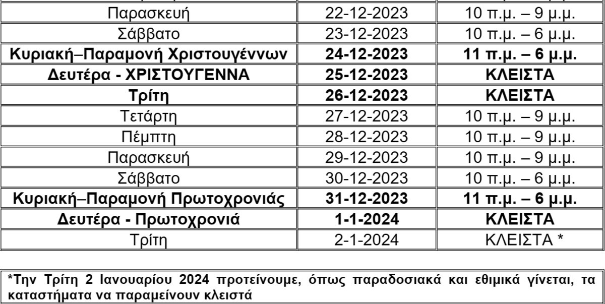 Αναλυτικά, το προτεινόμενο από τον Εμπορικό Σύλλογο Αθηνών ωράριο λειτουργίας των εμπορικών καταστημάτων για την εορταστική περίοδο των Χριστουγέννων 2023, έχει ως εξής: