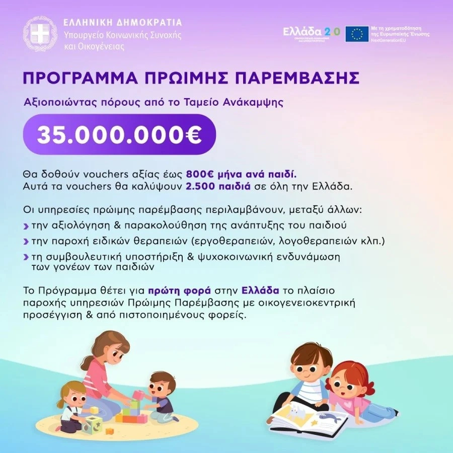 Το πρόγραμμα, αξιοποιώντας πόρους 35 εκατ. ευρώ από το Ταμείο Ανθεκτικότητας και Ανάκαμψης, θέτει για πρώτη φορά στην Ελλάδα το πλαίσιο παροχής υπηρεσιών Πρώιμης Παρέμβασης με τη δημιουργία μητρώου πιστοποιημένων φορέων Πρώιμης Παρέμβασης προκειμένου εξασφαλιστεί η ποιοτική παροχή υπηρεσιών προς τα παιδιά, αλλά και η παράλληλη ενδυνάμωση των οικογενειών τους. Μέχρι σήμερα υπάρχει έλλειψη ενός ενιαίου θεσμοθετημένου πλαισίου Πρώιμης Παρέμβασης, καθώς και απουσία χαρτογράφησης των πιστοποιημένων παρόχων υπηρεσιών Πρώιμης Παρέμβασης.