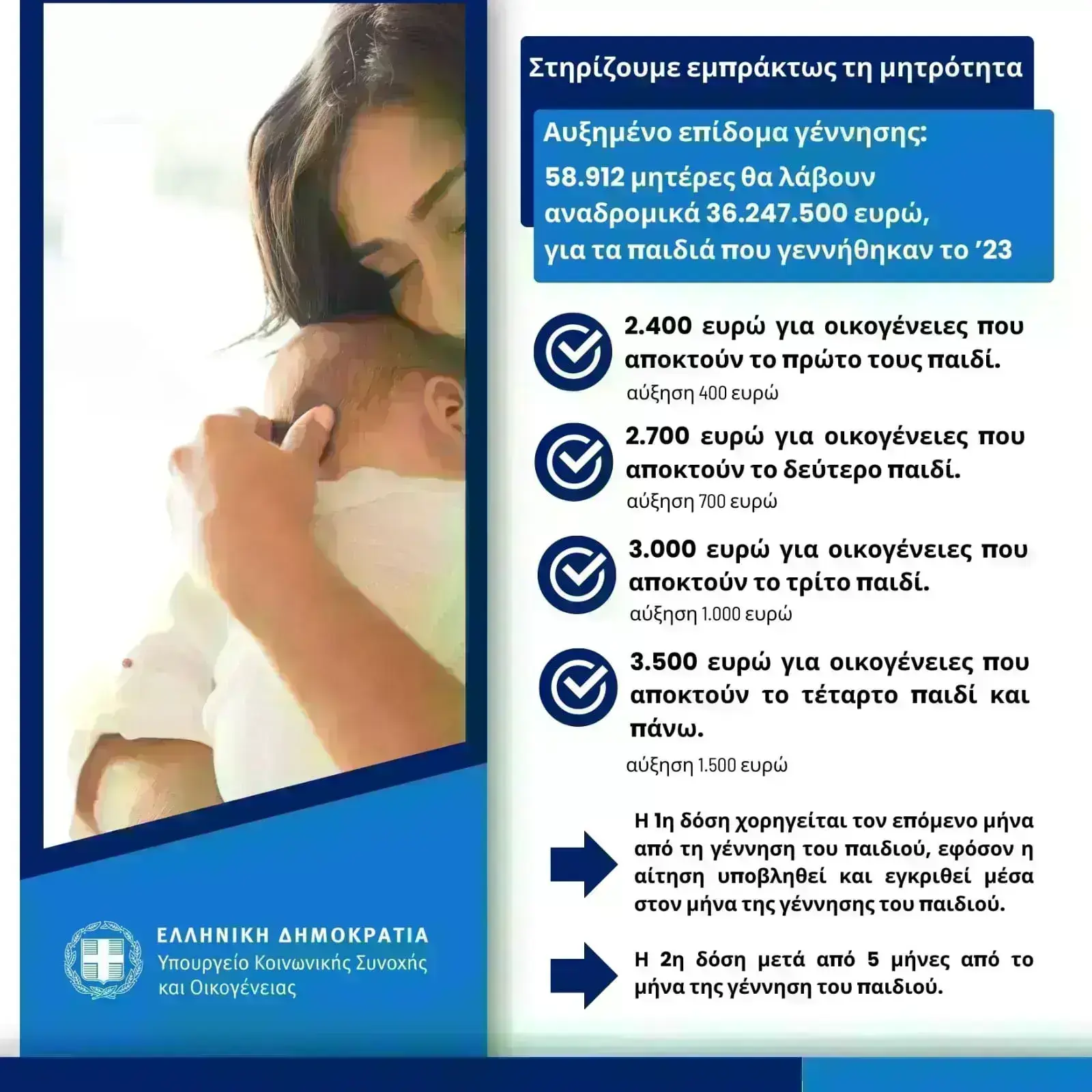 Μετά την ψήφιση του σχετικού νόμου τον περασμένο Φεβρουάριο, το επίδομα γέννησης αυξήθηκε στις 2.000 ευρώ 2.400 για ένα παιδί και ανάλογα με τον αριθμό των παιδιών η αύξηση φτάνει τα 1.500 ευρώ έως και το ποσό των 3.500 ευρώ.