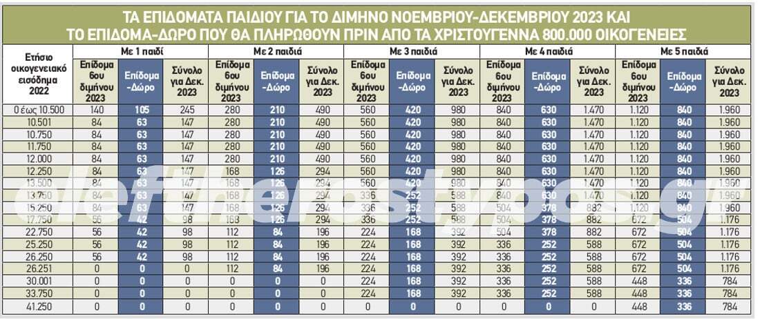 Τα επιδόματα παιδιού για το δίμηνο Νοεμβρίου-Δεκεμβρίου 2023 και το επίδομα-Δώρο που θα πληρωθούν πριν από τα Χριστούγεννα 800.000 οικογένειες