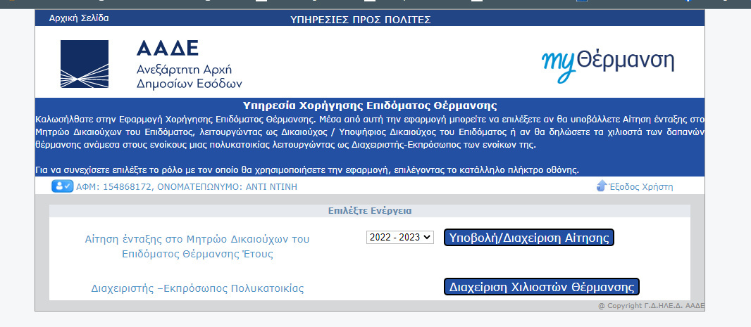 Κατά την είσοδο το myΘέρμανση ο δικαιούχος επιλέγει αν θα υποβάλει αίτηση ένταξης στο Μητρώο Δικαιούχων του Επιδόματος, λειτουργώντας ως Δικαιούχος / Υποψήφιος Δικαιούχος του Επιδόματος ή αν θα δηλώσει τα χιλιοστά των δαπανών θέρμανσης ανάμεσα στους ενοίκους μιας πολυκατοικίας λειτουργώντας ως Διαχειριστής-Εκπρόσωπος των ενοίκων της.