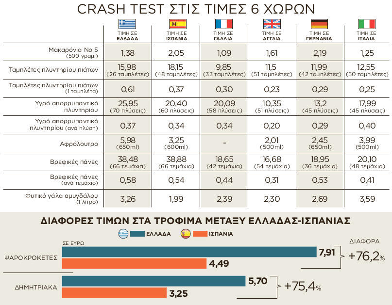 Ενδεικτικά, οι ταμπλέτες για πλυντήριο πιάτων πωλούνται στη χώρα μας κατά 166% ακριβότερα σε σχέση με την «ακριβή» Αγγλία και κατά 144% με την Ιταλία. Συσκευασία με 26 ταμπλέτες μεγάλης πολυεθνικής εταιρίας κοστίζει στην Ελλάδα 15,98 ευρώ, όταν στο Ηνωμένο Βασίλειο συσκευασία με 51 ταμπλέτες – δηλαδή σχεδόν οι διπλάσιες- διατίθενται στην τιμή των 11,5 ευρώ (σ.σ.: έχει γίνει η μετατροπή από βρετανική λίρα σε ευρώ) και στη Γερμανία οι 50 ταμπλέτες πωλούνται έναντι 12,55 ευρώ. Εν ολίγοις, οι Ελληνες πληρώνουν τη μια ταμπλέτα 0,61 ευρώ, οι Αγγλοι 0,23 ευρώ, οι Ιταλοί 0,25 ευρώ, οι Γερμανοί 0,29 ευρώ, οι Γάλλοι 0,30 ευρώ και οι Ισπανοί 0,37 ευρώ. Αξίζει βέβαια να σημειωθεί ότι οι πολυεθνικές, αν και διαθέτουν απορρυπαντικά σε όλα τα μεγέθη, σε κάθε αγορά που δραστηριοποιούνται πωλούν διαφορετικές σε μέγεθος συσκευασίας, δηλαδή δεν υπάρχει ακριβής αντιστοιχία στις συσκευασίες.