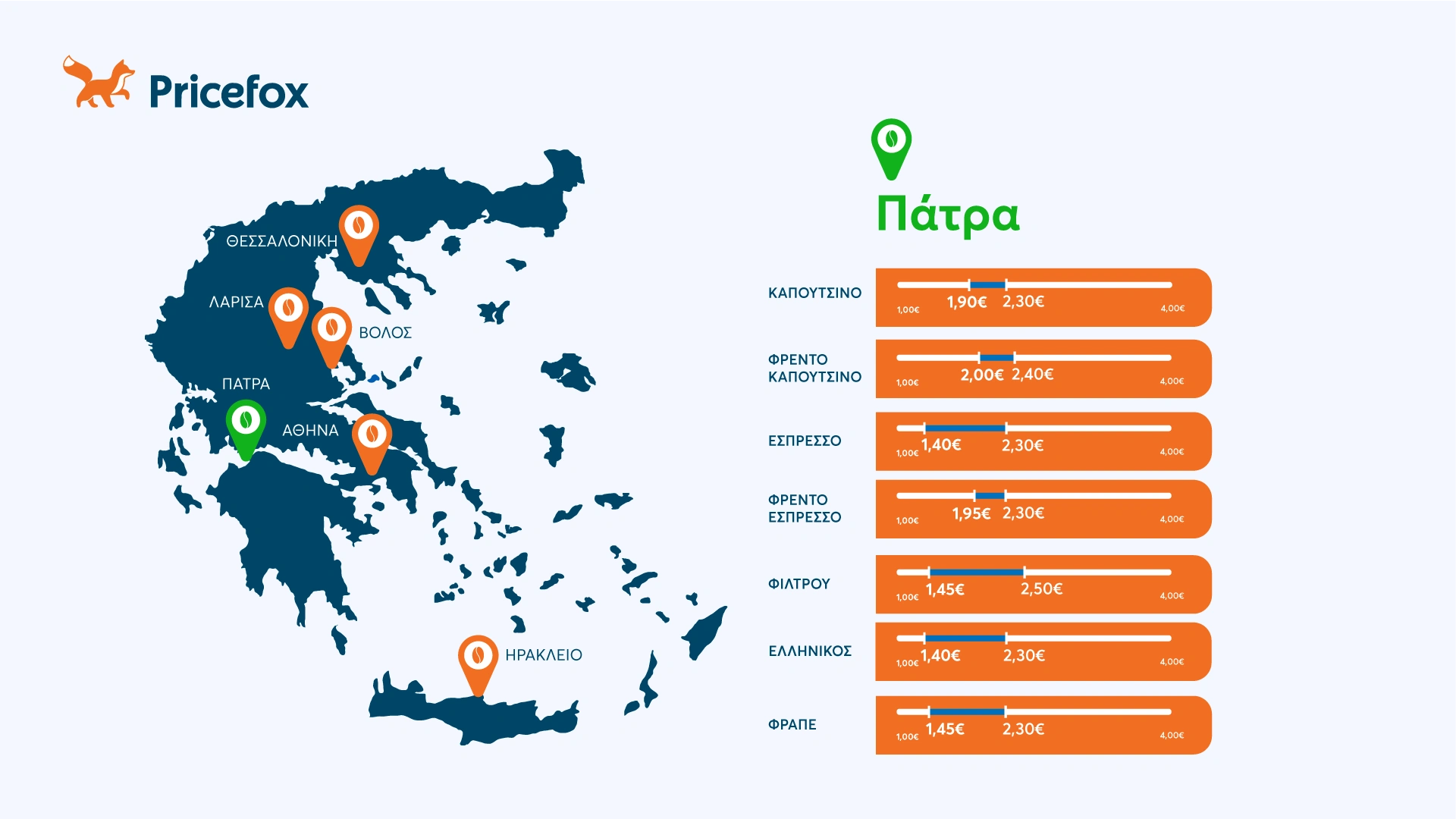 Όπως και στις άλλες δύο πόλεις, έτσι και στην Πάτρα, ο ακριβότερος καφές είναι ο καφές φίλτρου με 2,50€. Φθηνότεροι παραμένουν ο ελληνικός και ο εσπρέσο, οι οποίοι όμως αυξήθηκαν σε κόστος με ελάχιστη τιμή το 1,40€, ενώ την ίδια περίοδο πέρυσι κόστιζαν μόλις 1,00€ και 1,30€ αντίστοιχα . Αυξήθηκαν και οι τιμές για το Φρέντο Εσπρέσο, αλλά όχι τόσο πολύ με μέγιστη τιμή τα 2,03€. Γενικότερα, οι τιμές του καφέ στην Πάτρα είναι πιο σταθερές. Θα βρεις εύκολα στο κέντρο της πόλης καφέδες από 1,40€ μέχρι και 2,50€, το οποίο δεν συναντάμε σε καμία από τις άλλες πόλεις.
