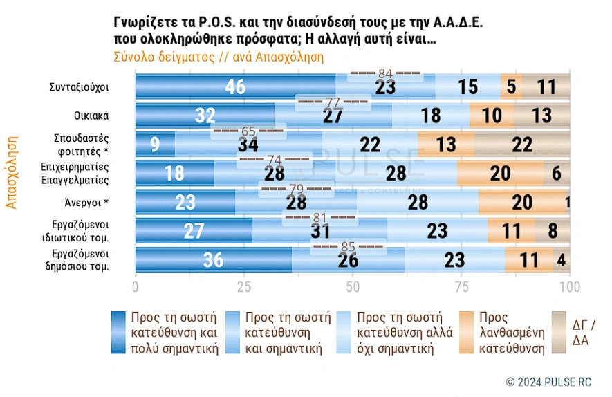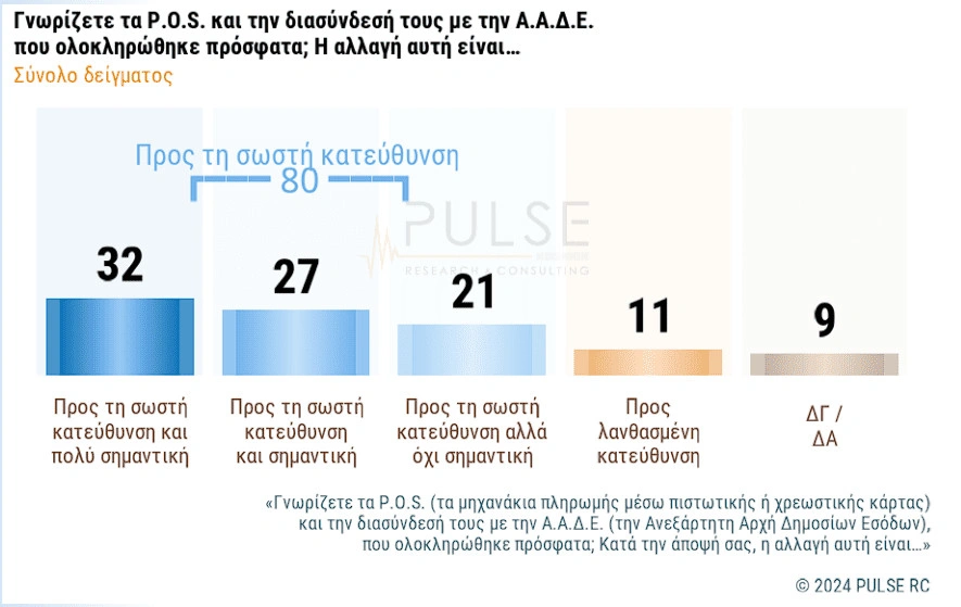 Στην ερώτηση για την στάση των πολιτών στο μεγάλο έργο της διασύνδεσής των POS με τις ταμειακές μηχανές, σχεδόν όλοι θεωρούν ότι αποτελεί μια εξέλιξη προς τη σωστή κατεύθυνση . Οι 8 στους 10 κρίνουν ότι είναι προς τη σωστή κατεύθυνση και επιπρόσθετα, οι 6 στους 10 την χαρακτηρίζουν σημαντική έως πολύ σημαντική. Μόνο 1 στους 10 βρίσκει ότι κινείται προς λανθασμένη κατεύθυνση.