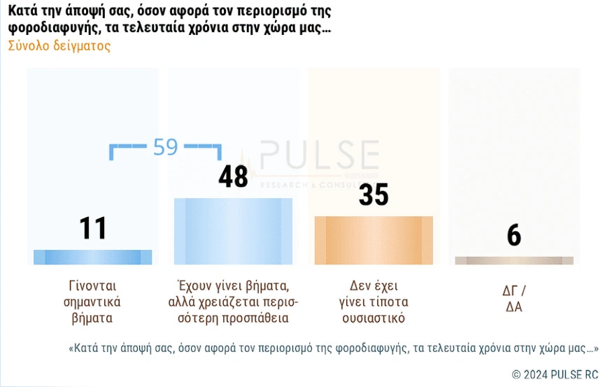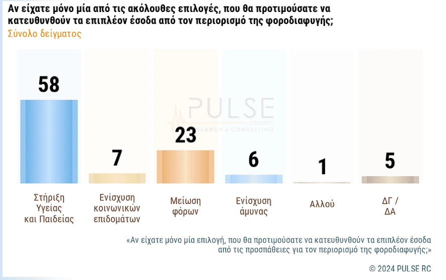 Στο ερώτημα «πού θα προτιμούσατε να κατευθυνθούν τα επιπλέον έσοδα από τον περιορισμό της φοροδιαφυγής», οι 6 στους 10 απάντησαν στην περαιτέρω στήριξη της Παιδείας και της Υγείας.