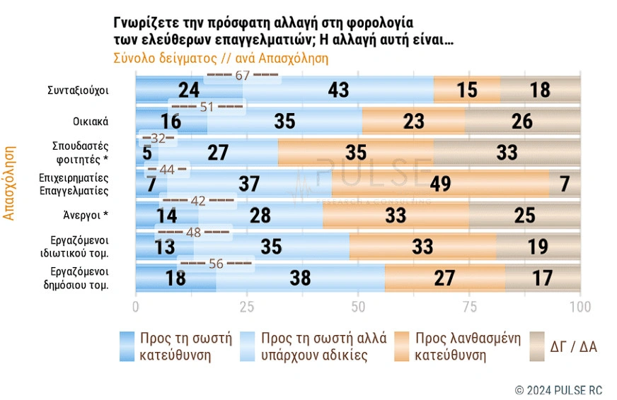 Σε ό,τι αφορά την πρόσφατη αλλαγή στη φορολογία των ελεύθερων επαγγελματιών και αν αυτή κινείται προς την σωστή ή την λάθος κατεύθυνση, το 49% των ερωτηθέντων βρίσκει ότι είναι προς την λάθος κατεύθυνση και μαζί τους συντάσσεται το 35% των φοιτητών και το 33% των εργαζομένων στον ιδιωτικό τομέα.
