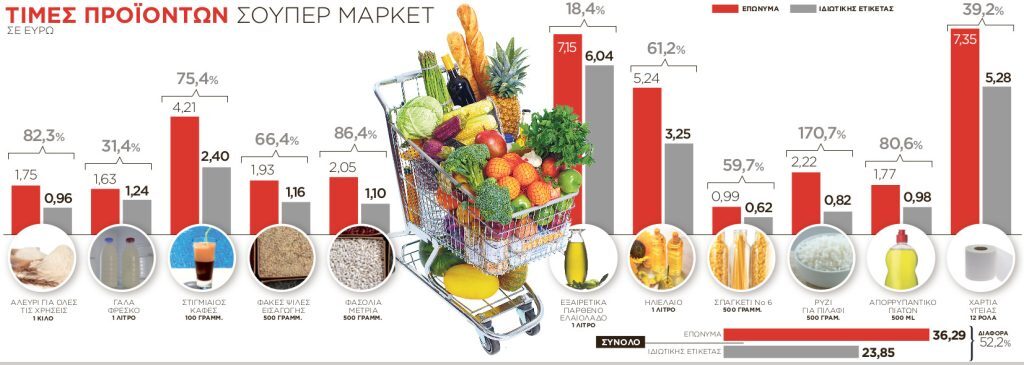 Σύμφωνα με έρευνα που διενήργησε ο «Ε.Τ.» της Κυριακής, λαμβάνοντας τιμές βασικών επώνυμων ειδών από το παρατηρητήριο τιμών του υπουργείου Ανάπτυξης, e-katanalotis, και από μεγάλη αλυσίδα σούπερ μάρκετ με private label προϊόντα, προκύπτει ότι ένα καλάθι με 11 προϊόντα ιδιωτικής ετικέτας καθημερινής χρήσης είναι κατά 52,2% φθηνότερο σε σχέση με ένα καλάθι που ο καταναλωτής έχει επιλέξει γνωστές μάρκες.