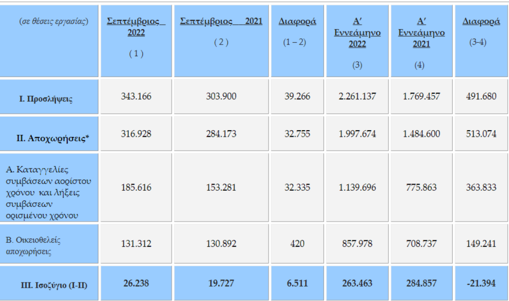 Τον Σεπτέμβριο, οι αναγγελίες πρόσληψης ανήλθαν σε 343.166, ενώ οι αποχωρήσεις έφτασαν τις 316.928 (131.312 οικειοθελείς αποχωρήσεις και 185.616 καταγγελίες συμβάσεων αορίστου χρόνου ή λήξεις συμβάσεων ορισμένου χρόνου). Συνεπώς, το ισοζύγιο του Σεπτεμβρίου ήταν θετικό κατά 26.238 θέσεις εργασίας.