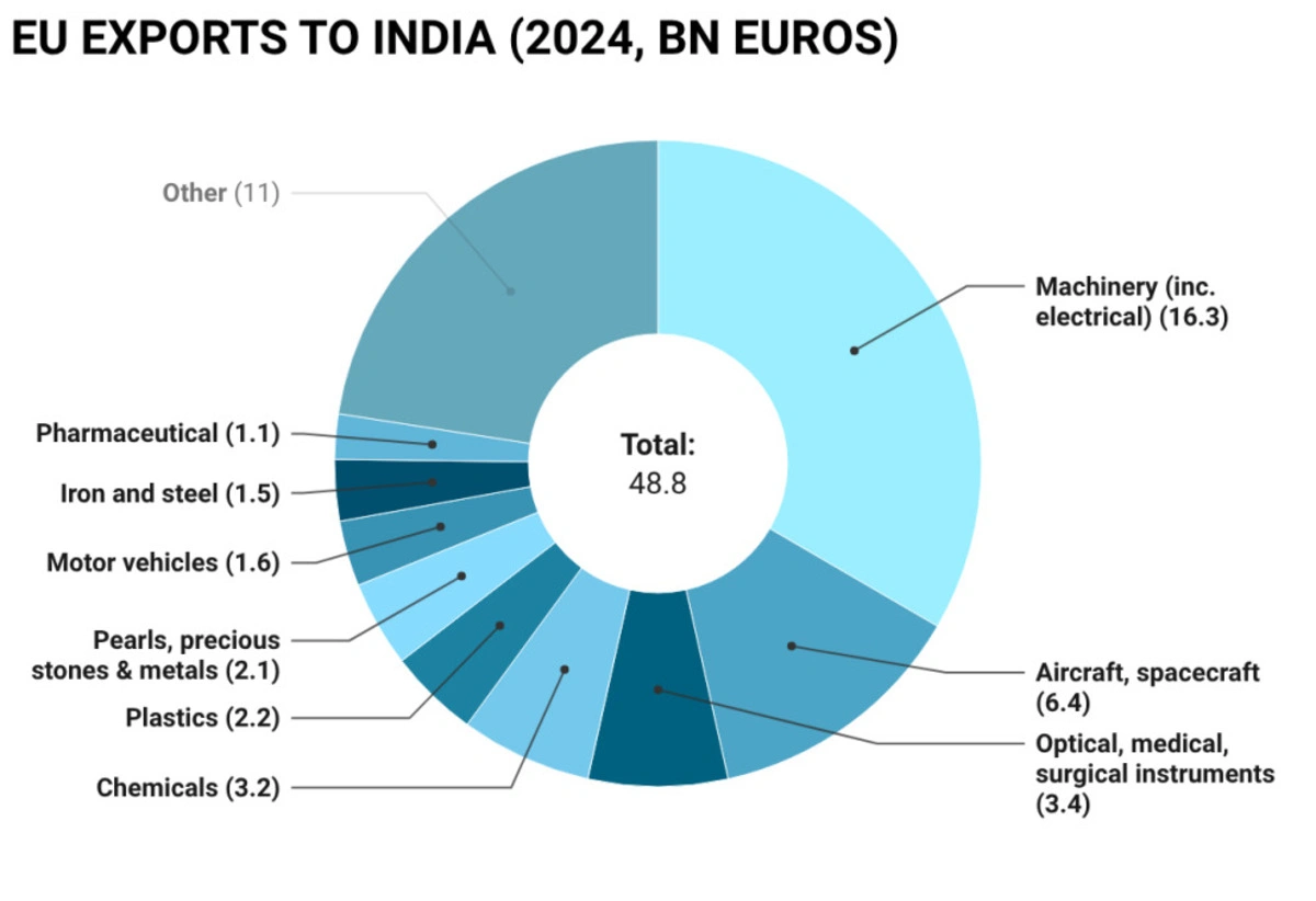 Το 2024, οι εξαγωγές της ΕΕ προς την Ινδία ανήλθαν συνολικά σε περίπου 75 δισ. ευρώ, με 48,8 δισ. ευρώ να προέρχονται από εμπορεύματα και 26 δισ. ευρώ από υπηρεσίες.