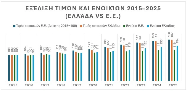 Σύμφωνα με πρόσφατη έρευνα της BluPeak Estate Analytics, από το 2017 έως το 2024, οι τιμές των κατοικιών αυξήθηκαν πάνω από 50%, ενώ σε περιοχές όπως η Αθήνα, η Θεσσαλονίκη και η Κρήτη η αύξηση ξεπερνά το 70%. Παράλληλα, η προσφορά διαθέσιμων ενοικίων έχει μειωθεί, καθώς χιλιάδες ακίνητα διοχετεύονται σε βραχυχρόνιες μισθώσεις ή παραμένουν κενά λόγω γραφειοκρατίας και φορολογικών ασυνεπειών.