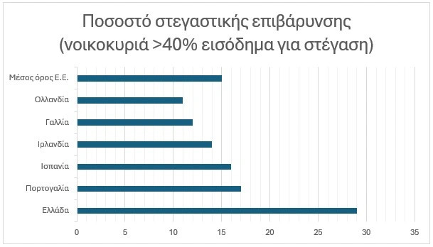 Ένα ιδιαίτερα ανησυχητικό στοιχείο είναι ότι το 29% των νοικοκυριών στις ελληνικές πόλεις δαπανά πάνω από το 40% του εισοδήματός του για στέγαση — το υψηλότερο ποσοστό σε ολόκληρη την Ευρωπαϊκή Ένωση. Επιπλέον, χιλιάδες ακίνητα παραμένουν ανενεργά ή αδήλωτα, γεγονός που στερεί από την οικονομία πολύτιμα αποθέματα κατοικίας και μειώνει την ακρίβεια των στοιχείων για τη χάραξη πολιτικής.