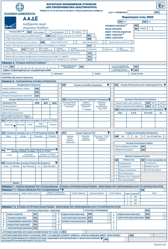 Πρέπει να σημειωθεί πως το νέο Ε3 περιλαμβάνει καινούργιους κωδικούς, κατά τη συμπλήρωση των οποίων θα πρέπει να δοθεί ιδιαίτερη προσοχή από τους υπόχρεους, καθώς η κατάσταση οικονομικών στοιχείων από επιχειρηματική δραστηριότητα συνυποβάλλεται με τις εμπρόθεσμες και εκπρόθεσμες αρχικές και τροποποιητικές δηλώσεις με τα έντυπα Ε1 (Δήλωση Φορολογίας Εισοδήματος φυσικών προσώπων) και Ν (Δήλωση Φορολογίας Εισοδήματος νομικών προσώπων και νομικών οντοτήτων) υποχρεωτικά με τη χρήση ηλεκτρονικής μεθόδου επικοινωνίας ή σε χειρόγραφη μορφή στη ΔΟΥ κατά περίπτωση.