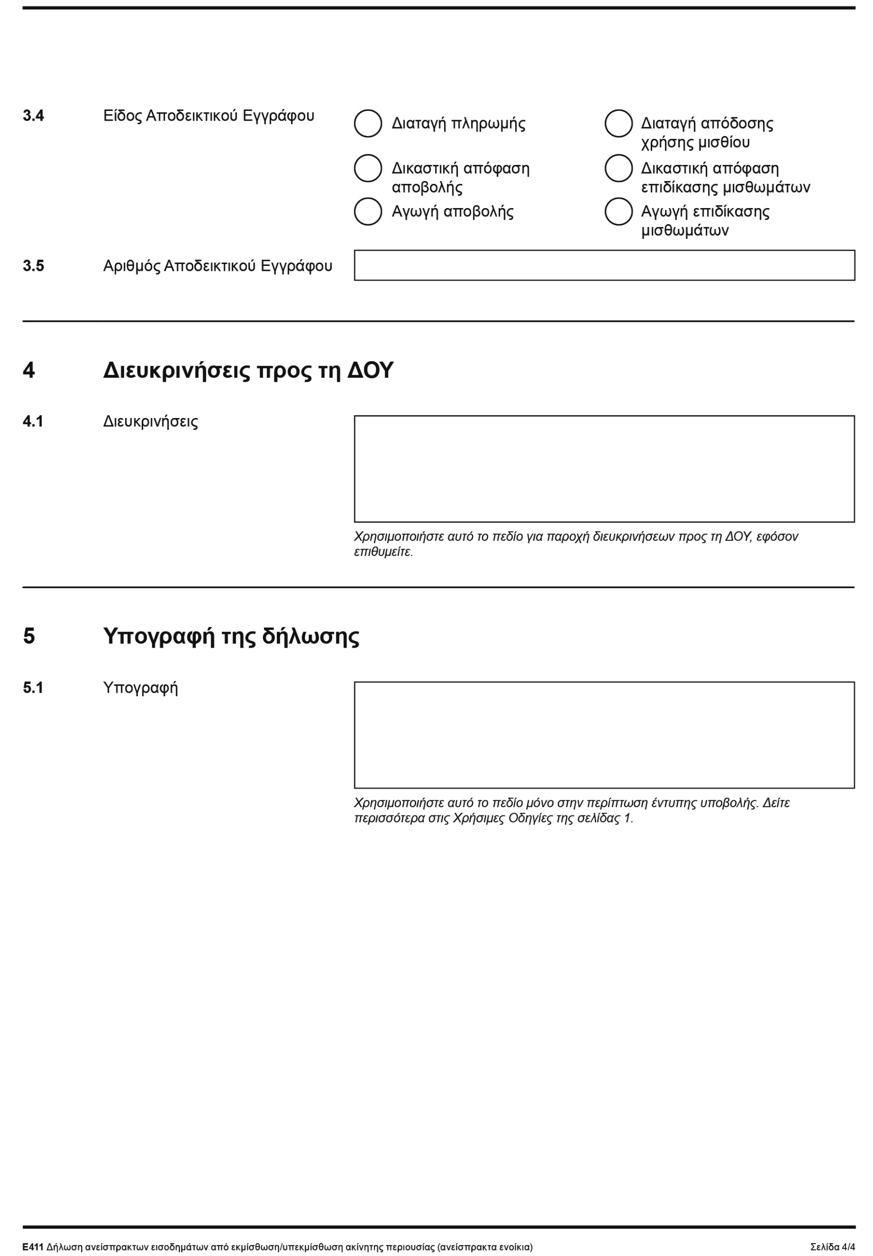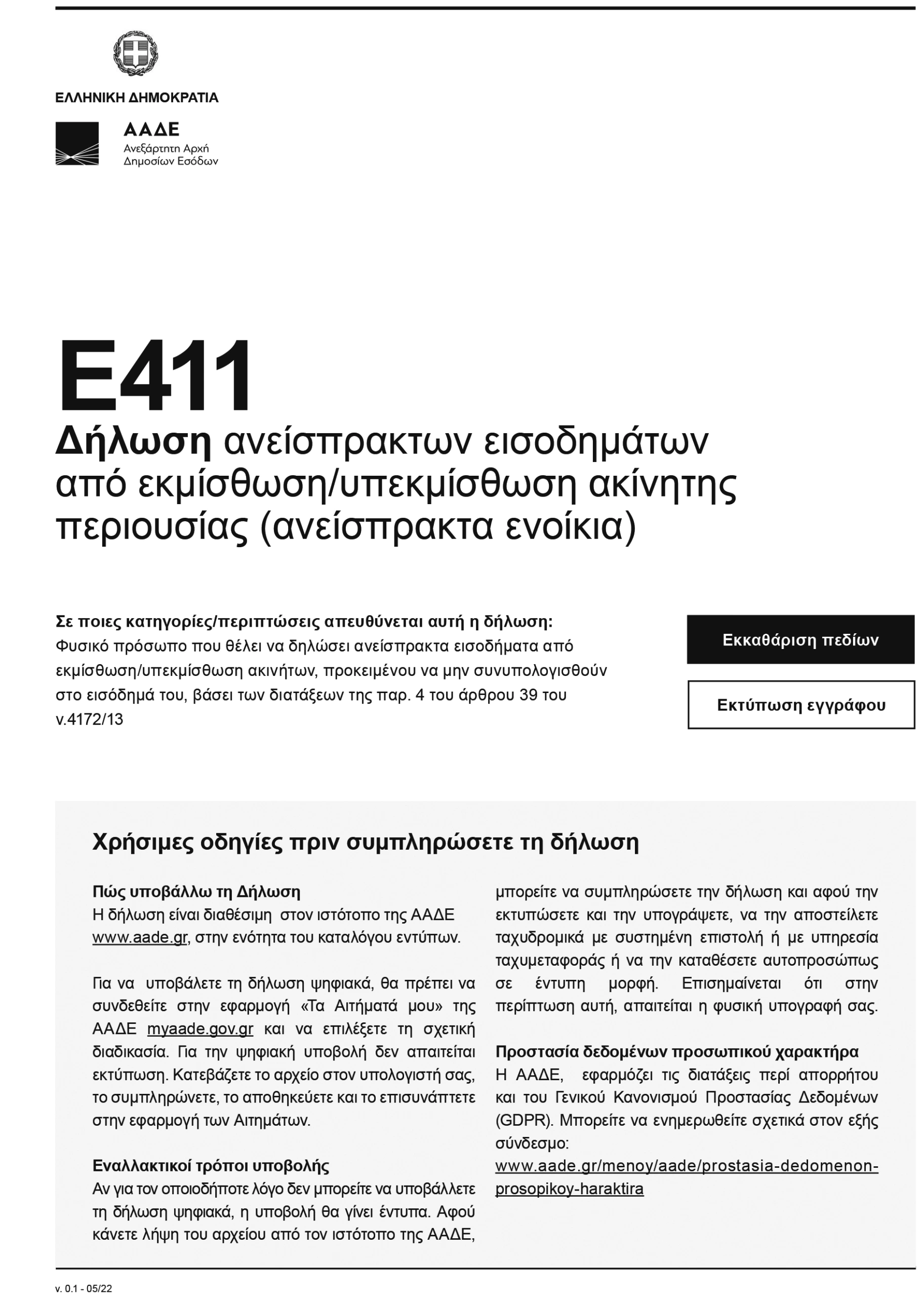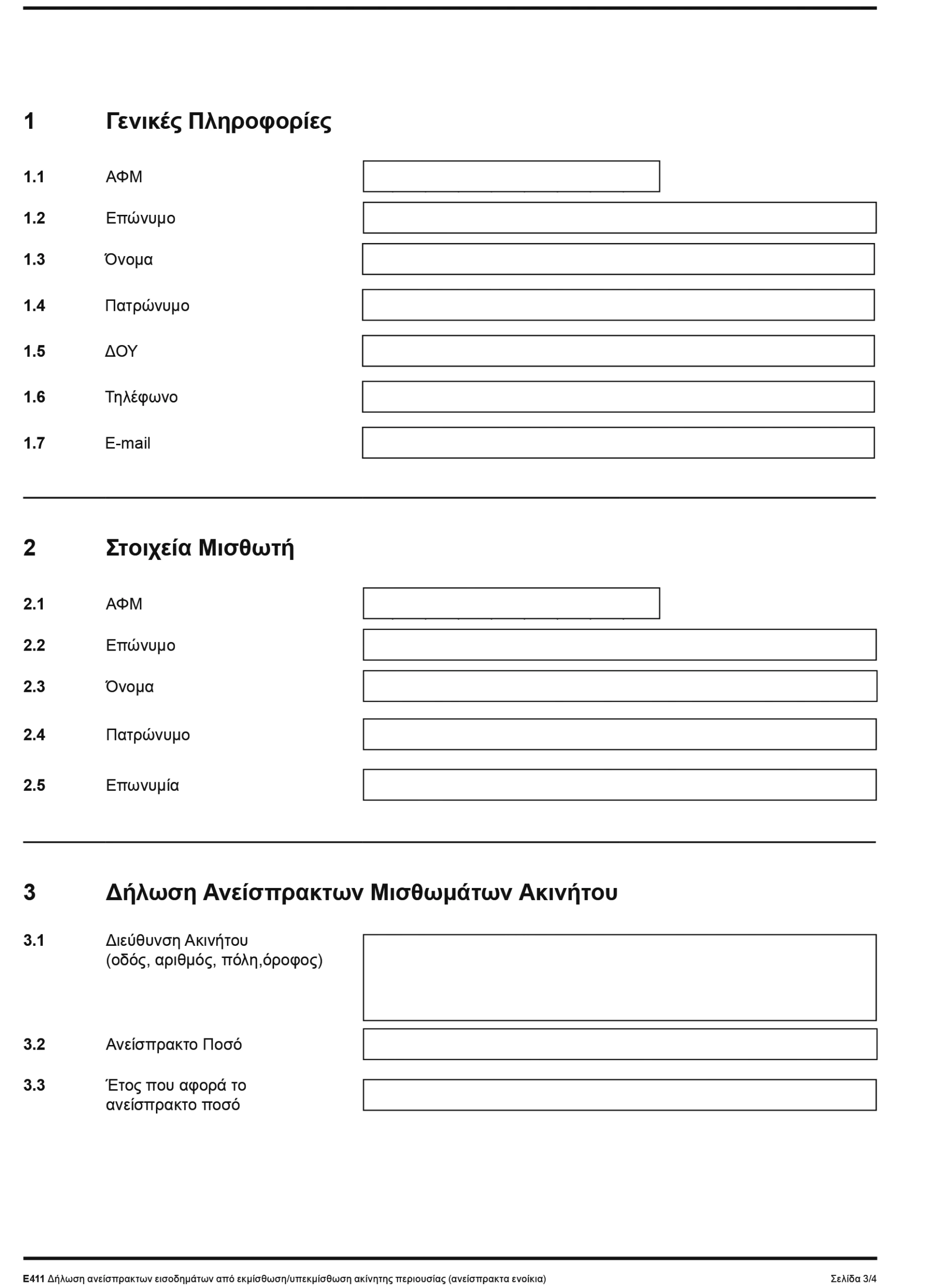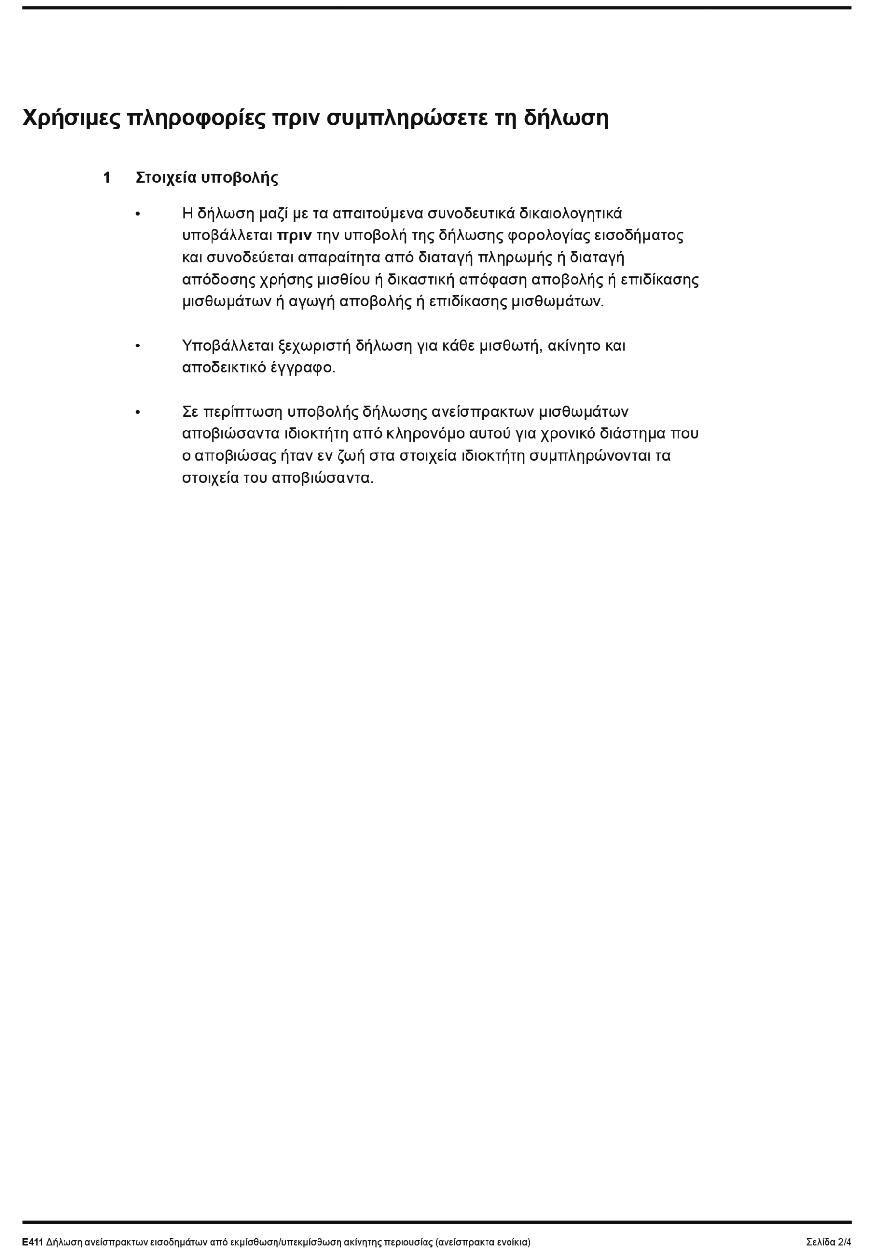 * Για κάθε μισθωτή, ακίνητο και αποδεικτικό έγγραφο υποβάλλεται ξεχωριστή δήλωση Ε411. Σε περίπτωση υποβολής δήλωσης ανείσπρακτων μισθωμάτων (Ε411) αποβιώσαντος ιδιοκτήτη από κληρονόμο αυτού για χρονικό διάστημα που ο αποβιώσας ήταν εν ζωή, στα στοιχεία ιδιοκτήτη συμπληρώνονται τα στοιχεία του αποβιώσαντος.