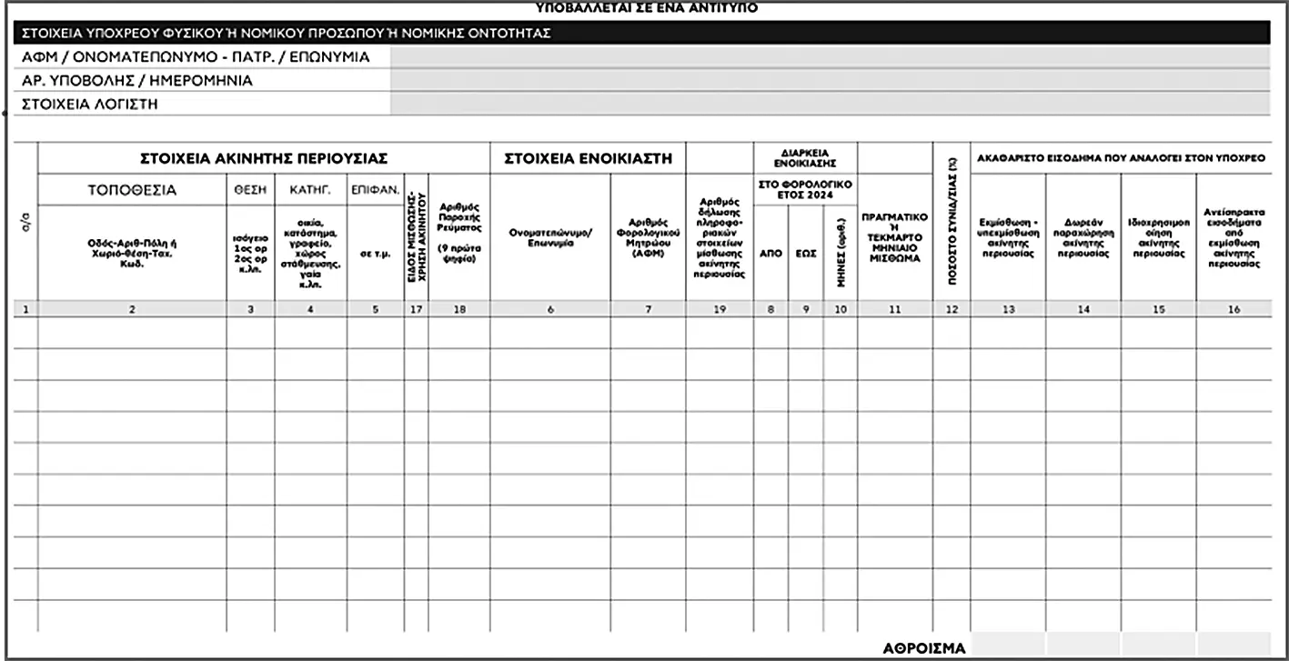 3 Οι στήλες 13, 14 και 15 συμπληρώνονται με το ακαθάριστο εισόδημα των ακινήτων που αναλογεί στον υπόχρεο κατά κατηγορία, όπως εμφανίζεται στους τίτλους των στηλών (εκμίσθωση-υπεκμίσθωση, δωρεάν παραχώρηση, ιδιοχρησιμοποίηση). Στις στήλες αυτές συμπληρώνονται και τα ανείσπρακτα εισοδήματα από εκμίσθωση ακίνητης περιουσίας, που δηλώθηκαν στα φορολογικά έτη 2015-2024 στους κωδικούς 125-126 και εισπράχθηκαν κατά το έτος 2025.