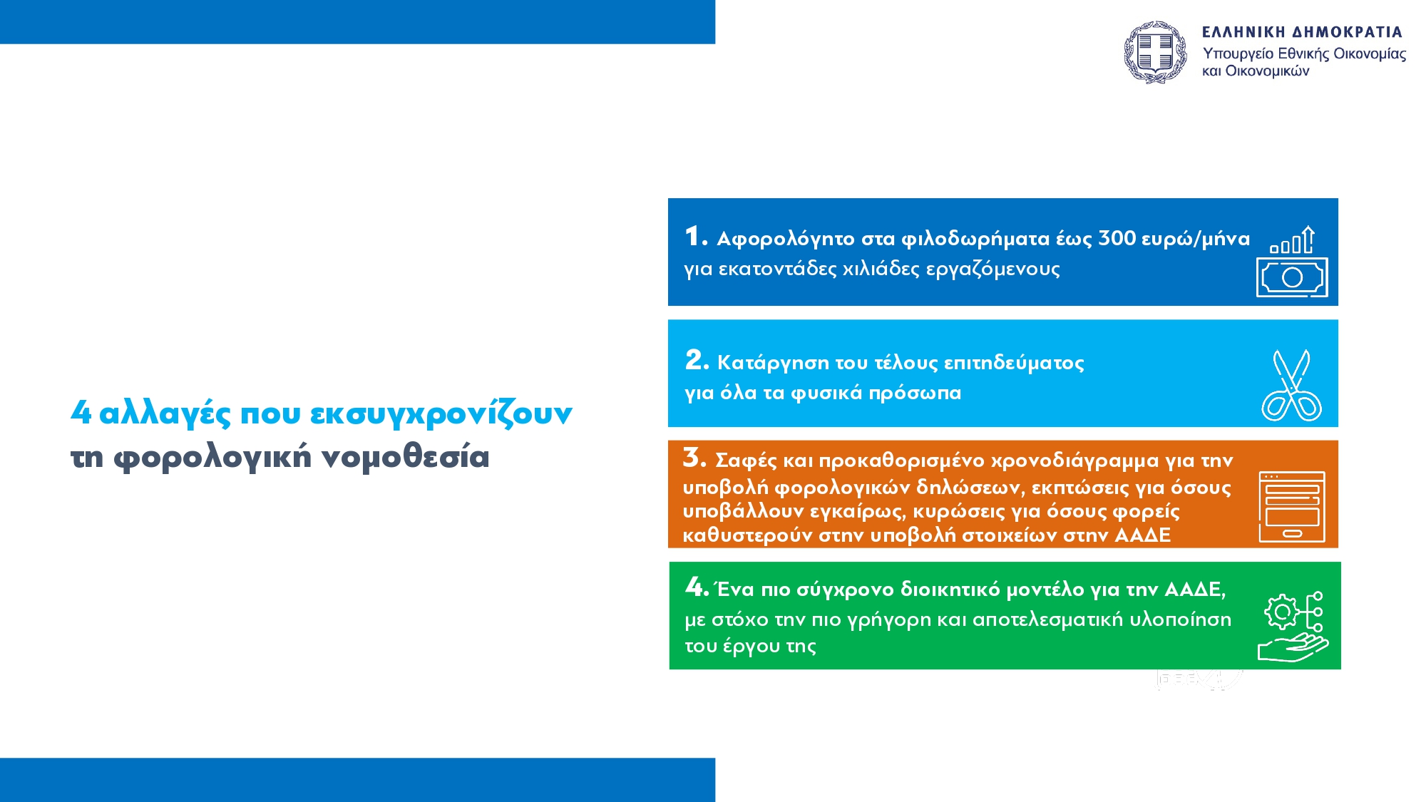 Συγκεκριμένα, πρώτον, θεσπίζεται αφορολόγητο στα φιλοδωρήματα έως 300 ευρώ τον μήνα και πλήρης απαλλαγή από τις ασφαλιστικές εισφορές για το σύνολο των φιλοδωρημάτων. Δεύτερον, καταργείται το τέλος επιτηδεύματος για όλα τα φυσικά πρόσωπα συμπεριλαμβανομένων και των εργαζομένων με «μπλοκάκι». Τρίτον, ορίζεται ένα σαφές και προκαθορισμένο χρονοδιάγραμμα για την υποβολή των φορολογικών δηλώσεων με ενίσχυση των εκπτώσεων για όσους πολίτες υποβάλλουν νωρίτερα τις δηλώσεις και κυρώσεις σε επικεφαλής φορέων που καθυστερούν την διαβίβαση στοιχείων στην ΑΑΔΕ. Τέταρτον, εισάγονται ορισμένες διοικητικές αλλαγές στην ΑΑΔΕ με στόχο την ακόμα μεγαλύτερη ταχύτητα και αποτελεσματικότητα του Οργανισμού.