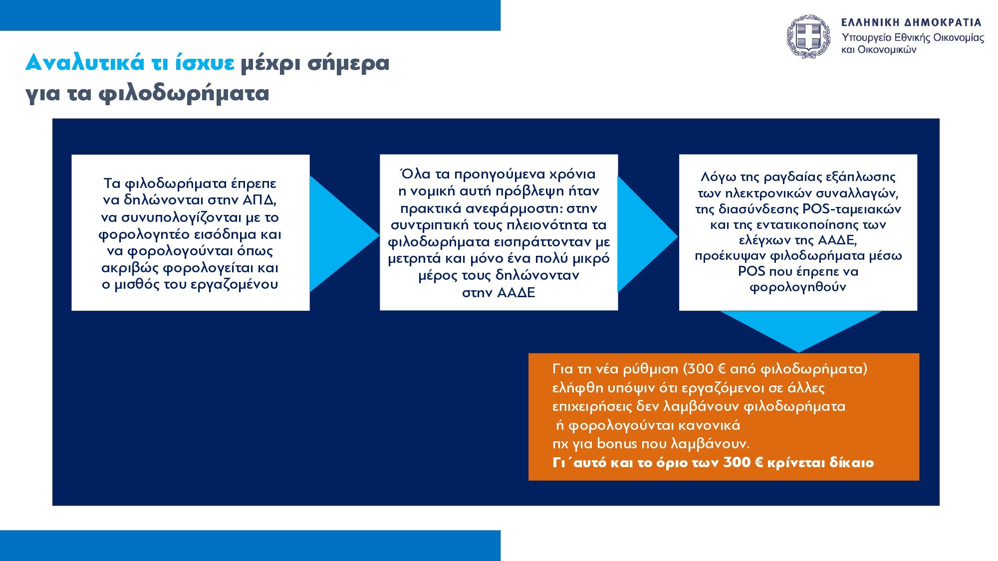 Ως εκ τούτου, το Υπουργείο Εθνικής Οικονομίας και Οικονομικών προχωρά στη θέσπιση μιας δίκαιης και ισορροπημένης διάταξης που προβλέπει για πρώτη φορά αφορολόγητο έως 300 ευρώ τον μήνα για φιλοδωρήματα που λαμβάνουν οι εργαζόμενοι (ενδεικτικά σε επιχειρήσεις εστίασης, παροχής υπηρεσιών ατομικής φροντίδας κλπ) με άμεση εφαρμογή από 1η Νοεμβρίου 2024. Παράλληλα, για το σύνολο του ποσού από φιλοδωρήματα, εργαζόμενοι και εργοδότες απαλλάσσονται από ασφαλιστικές εισφορές (εκτός αν προβλέπεται κάτι διαφορετικό από ατομικές ή συλλογικές Συμβάσεις). Το ύψος των 300 ευρώ αφορολόγητο επελέγη ως το πλέον δίκαιο καθότι ελήφθη υπόψη ότι εργαζόμενοι σε άλλες επιχειρήσεις δεν λαμβάνουν φιλοδωρήματα ή φορολογούνται κανονικά πχ για bonus που λαμβάνουν.