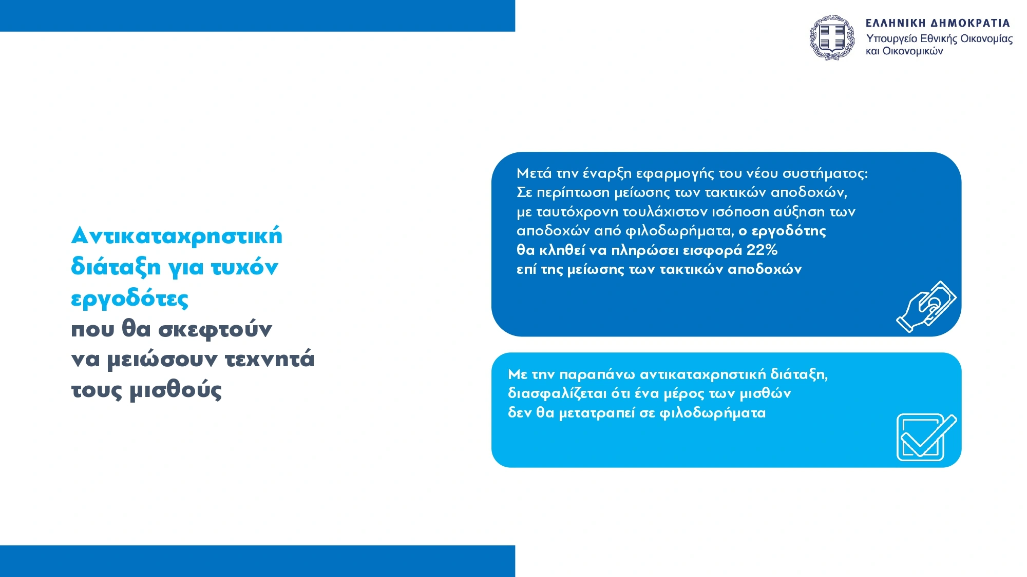 Παράλληλα, εισάγεται μια αντικαταχρηστική διάταξη για τυχόν εργοδότες που θα σκεφτούν να μειώσουν τεχνητά τους μισθούς δηλώνοντας μέρος αυτών ως φιλοδωρήματα: Σε περίπτωση μείωσης των τακτικών αποδοχών, με ταυτόχρονη ισόποση αύξηση των αποδοχών από φιλοδωρήματα, ο εργοδότης θα κληθεί να πληρώσει εισφορά 22% επί της μείωσης των τακτικών αποδοχών.