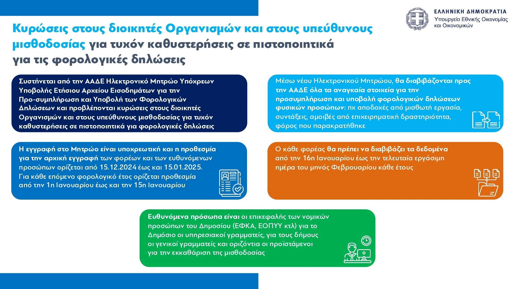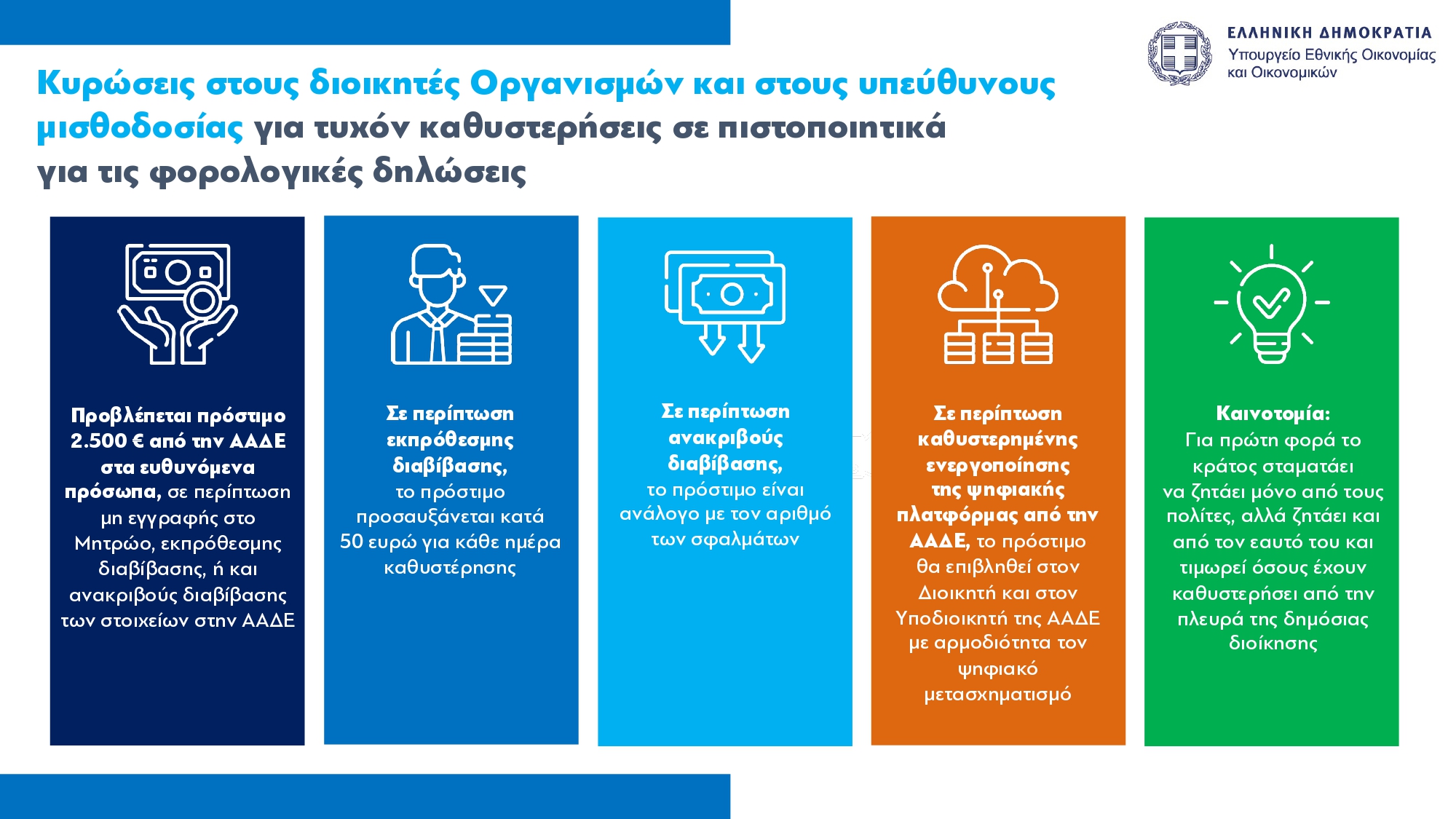 Παράλληλα εισάγεται για πρώτη φορά μια σημαντική καινοτομία. Προκειμένου να αποφευχθούν καθυστερήσεις στην διαδικασία υποβολής των δηλώσεων, θεσπίζονται κυρώσεις στους διοικητές Οργανισμών, στους υπηρεσιακούς γραμματείς του Δημοσίου και τους γενικούς γραμματείς των Δήμων καθώς και στους υπευθύνους μισθοδοσίας για τυχόν καθυστερήσεις στην αποστολή δεδομένων στην ΑΑΔΕ που είναι απαραίτητα για την έγκαιρη συμπλήρωση των φορολογικών δηλώσεων.