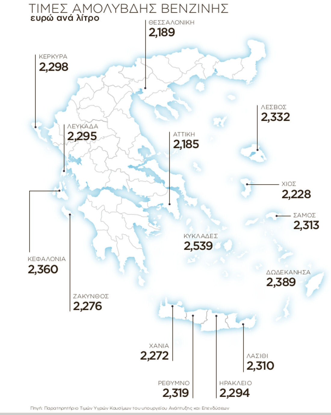 Σε επίπεδο νομών, χθες, στην Αττική η μέση τιμή της απλής αμόλυβδης ήταν στα 2,185 ευρώ το λίτρο και στη Θεσσαλονίκη στα 2,189 ευρώ. Οσον αφορά στους νησιωτικούς νομούς, στα Δωδεκάνησα διαμορφώθηκε στα 2,389 ευρώ το λίτρο, στη Ζάκυνθο στα 2,276 ευρώ, στο Ηράκλειο στα 2,294 ευρώ, στην Κέρκυρα στα 2,298 ευρώ, στην Κεφαλλονιά στα 2,360 ευρώ, στις Κυκλάδες στα 2,539 ευρώ, στο Λασίθι στα 2,310 ευρώ, στη Λέσβο στα 2,332 ευρώ, στη Λευκάδα στα 2,295 ευρώ, στο Ρέθυμνο στα 2,319 ευρώ, στη Σάμο στα 2,313 ευρώ, στα Χανιά στα 2,272 ευρώ και στη Χίο στα 2,228 ευρώ.
