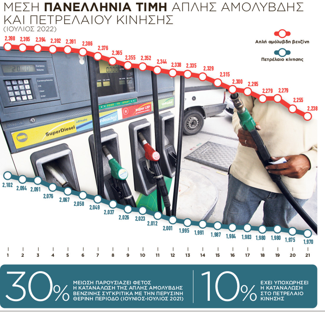 Μιλώντας στον «Ε.Τ.» ο αντιπρόεδρος της Πανελλήνιας Ομοσπονδίας Πρατηριούχων Εμπόρων Καυσίμων (ΠΟΠΕΚ), Γιώργος Ασμάτογλου, επεσήμανε πως φέτος καταγράφεται μείωση στην κατανάλωση της απλής αμόλυβδης βενζίνης, της τάξεως του 30%, συγκριτικά με την αντίστοιχη περυσινή θερινή περίοδο (Ιούνιος-Ιούλιος 2021). Στο δε πετρέλαιο κίνησης η μείωση της κατανάλωσης κυμαίνεται περίπου στο 10%. Ωστόσο, αξίζει να επισημανθεί πως η πλειονότητα των πετρελαιοκίνητων οχημάτων αφορά σε επαγγελματίες. Δεδομένου, λοιπόν, πως το αυτοκίνητο είναι «εργαλείο» της δουλειάς τους δεν θα μπορούσαν να κάνουν οικονομία στα καύσιμα, στο βαθμό που θα το έκανε κάποιος ιδιώτης, που θα μπορούσε να εξυπηρετηθεί από τις συγκοινωνίες.