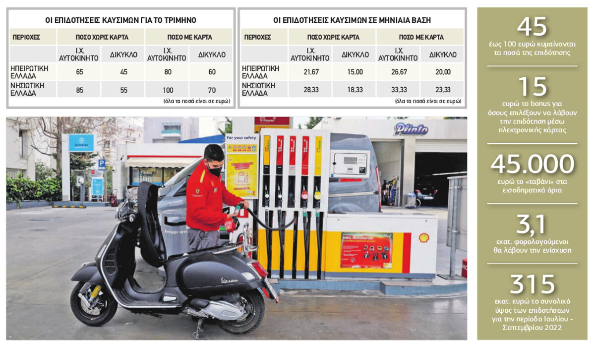 Ειδικά για τους πολίτες που έχουν κύρια κατοικία σε νησιωτική περιοχή η επιδότηση του Ι.Χ. για τους τρεις μήνες θα ανέρχεται σε 85 ευρώ (0,472 ευρώ το λίτρο), θα είναι δηλαδή αυξημένη κατά 30 ευρώ. Για ιδιοκτήτες μοτοσικλετών που κατοικούν στην ηπειρωτική Ελλάδα, η επιδότηση θα ανέρχεται σε 45 ευρώ (0,25 ευρώ ανά λίτρο), ενώ για όσους διαμένουν μόνιμα σε νησιωτική περιοχή η ενίσχυση θα φθάνει τα 55 ευρώ (0,305 ευρώ ανά λίτρο).