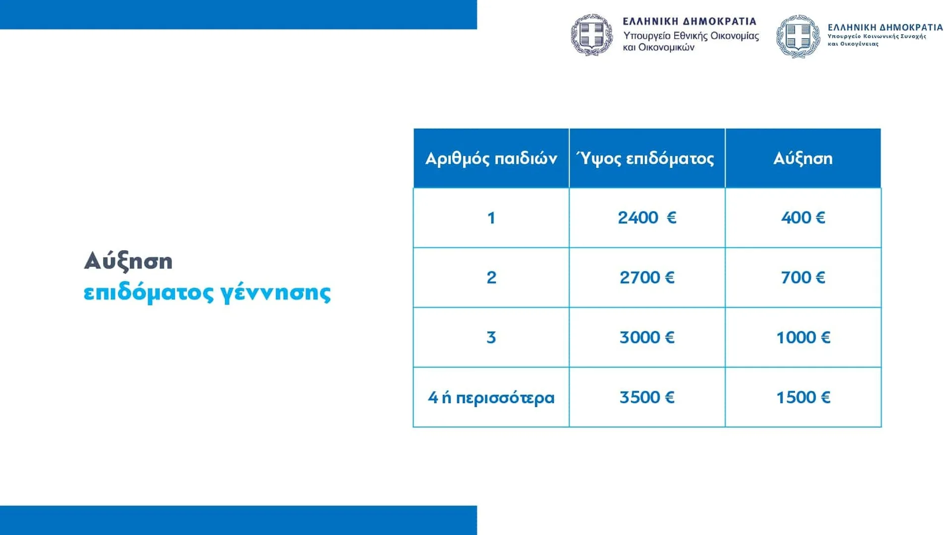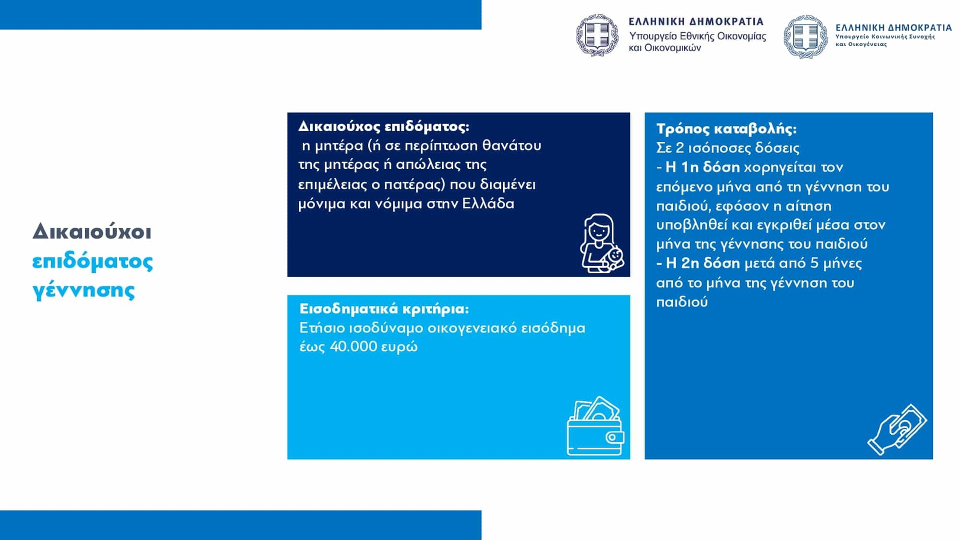 Αυξάνεται μόνιμα και αναδρομικά από τις γεννήσεις που έγιναν από 1/1/2023, από 2000 ευρώ για κάθε τέκνο σε 2.400 έως 3.500 ευρώ (αύξηση κατά 400 έως 1.500 ευρώ) αναλόγως του αριθμού των τέκνων. Υπενθυμίζεται πως από 1/1/2020 έχει θεσμοθετηθεί επίδομα γέννησης ύψους 2.000 ευρώ για κάθε παιδί που γεννιέται. Δικαιούχος είναι η μητέρα που διαμένει μόνιμα και νόμιμα στην Ελλάδα και έχει ετήσιο ισοδύναμο οικογενειακό εισόδημα έως 40.000 ευρώ. Σήμερα η ενίσχυση ανέρχεται σε 2000 ευρώ και καταβάλλεται σε δύο ισόποσες δόσεις των 1.000 ευρώ. Πλέον, το επίδομα γέννησης αυξάνεται για κάθε παιδί που γεννιέται αναλόγως του αριθμού των εξαρτώμενων τέκνων της οικογένειας (όπως αυτός διαμορφώνονται μετά τη γέννηση του παιδιού) ως ακολούθως: