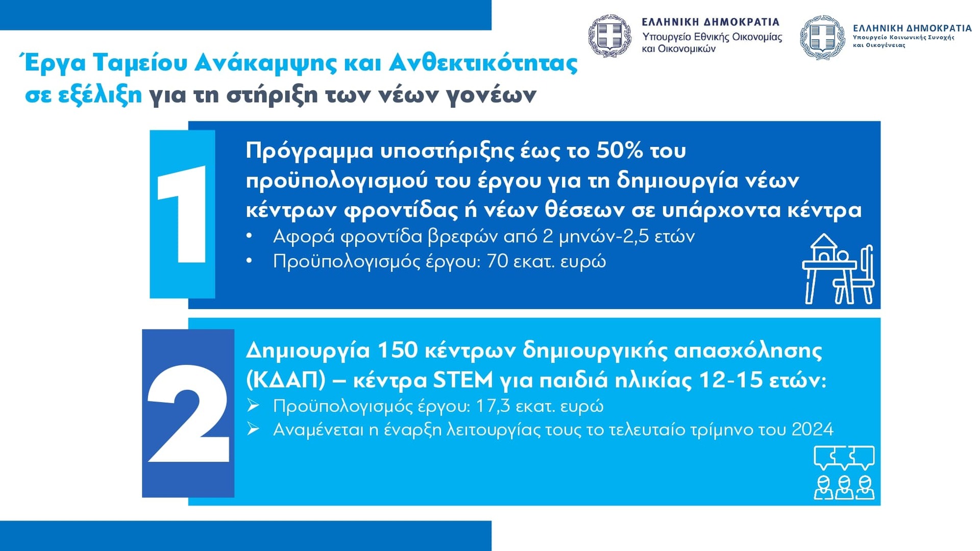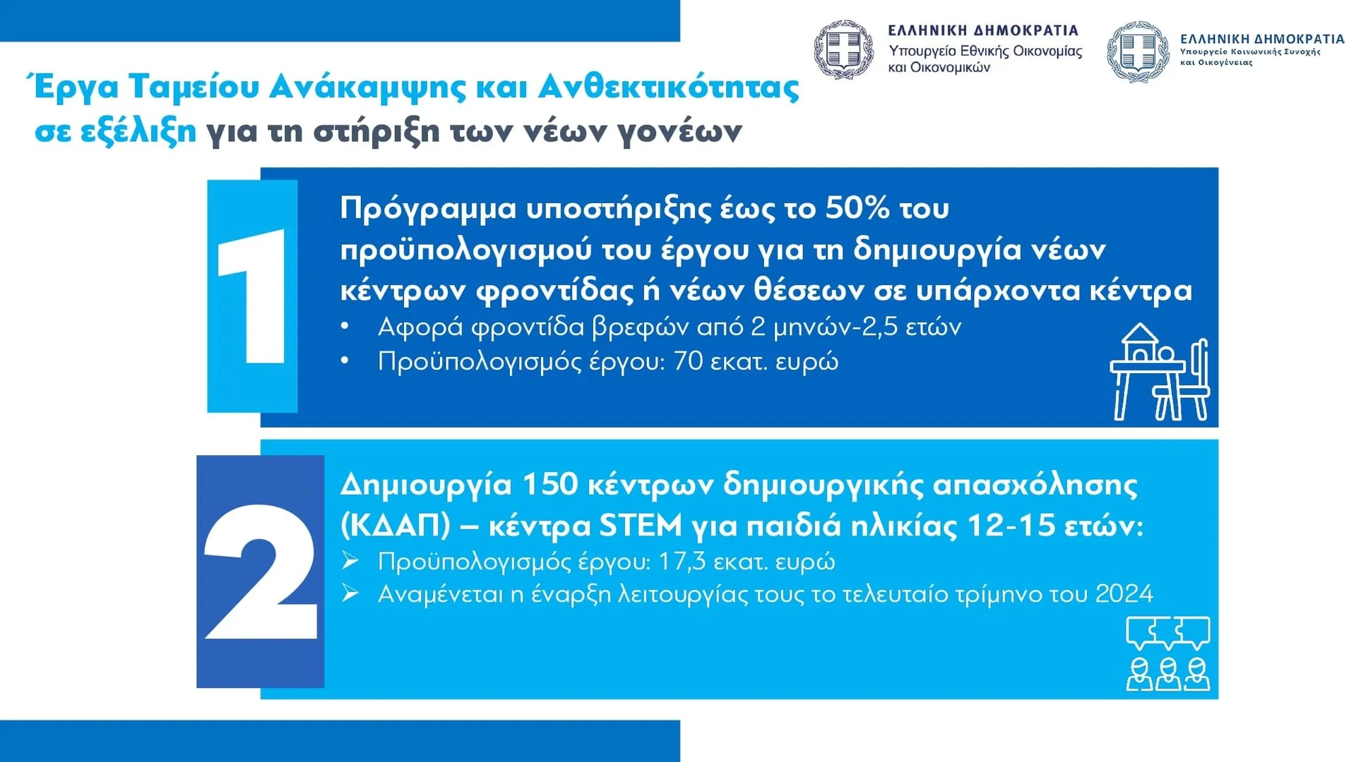 β) Δημιουργία 150 κέντρων δημιουργικής απασχόλησης (ΚΔΑΠ) –κέντρα STEM για παιδιά ηλικίας 12-15 ετών. Προϋπολογισμός έργου 17,3 εκατ. ευρώ. Αναμένεται η έναρξη λειτουργίας τους το τελευταίο τρίμηνο του 2024.