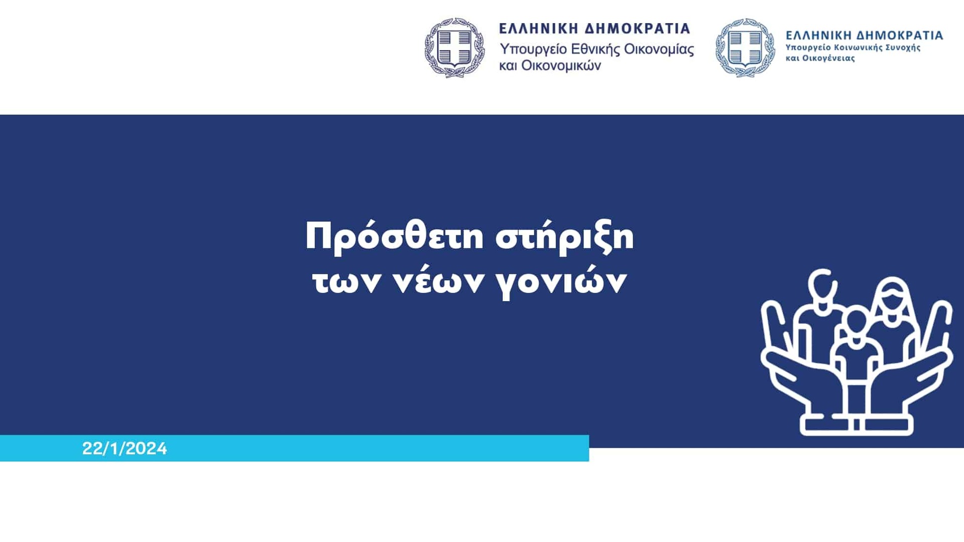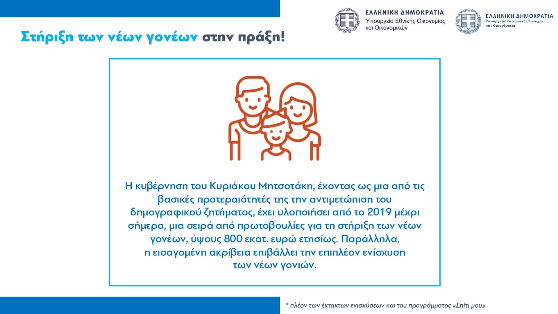 Η εισαγόμενη πληθωριστική κρίση επιβάλλει τη λήψη πρόσθετων πρωτοβουλιών για τη στήριξη των νέων γονέων. Έτσι, η Κυβέρνηση προχωρά στην αναδρομική και μόνιμη αύξηση του επιδόματος γέννησης, που το επιπλέον δημοσιονομικό κόστος για την αύξηση του θα καλυφθεί από την εξοικονόμηση 100 εκατ. ευρώ από επιδόματα που λάμβαναν μέχρι πρότινος οι ελεύθεροι επαγγελματίες που δήλωναν πολύ χαμηλά εισοδήματα. Παράλληλα, μέσα στο 2024 πρόκειται να υλοποιηθούν 6 ακόμη μέτρα στήριξης των νέων γονέων και της οικογένειας συνολικού ύψους 441 εκατ. ευρώ., τα οποία έρχονται να προστεθούν σε όσα υλοποιούνται ήδη από την Κυβέρνηση σταδιακά από το 2019 μέχρι σήμερα.