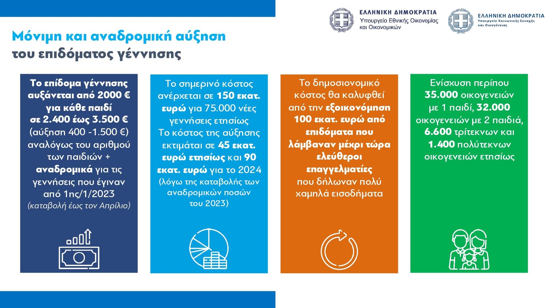 Το σημερινό κόστος του επιδόματος γέννησης ανέρχεται σε 150 εκατ. ευρώ και αφορά σε περίπου 75.000 νέες γεννήσεις ετησίως. Το κόστος της εν λόγω αύξησης εκτιμάται σε 45 εκατ. ευρώ ετησίως και 90 εκατ. ευρώ για το 2024 (λόγω της καταβολής των αναδρομικών ποσών του 2023) και ενισχύει περίπου 35.000 οικογένειες με 1 παιδί, 32.000 οικογένειες με 2 παιδιά, 6.600 τρίτεκνες και 1.400 πολύτεκνες οικογένειες ετησίως.
