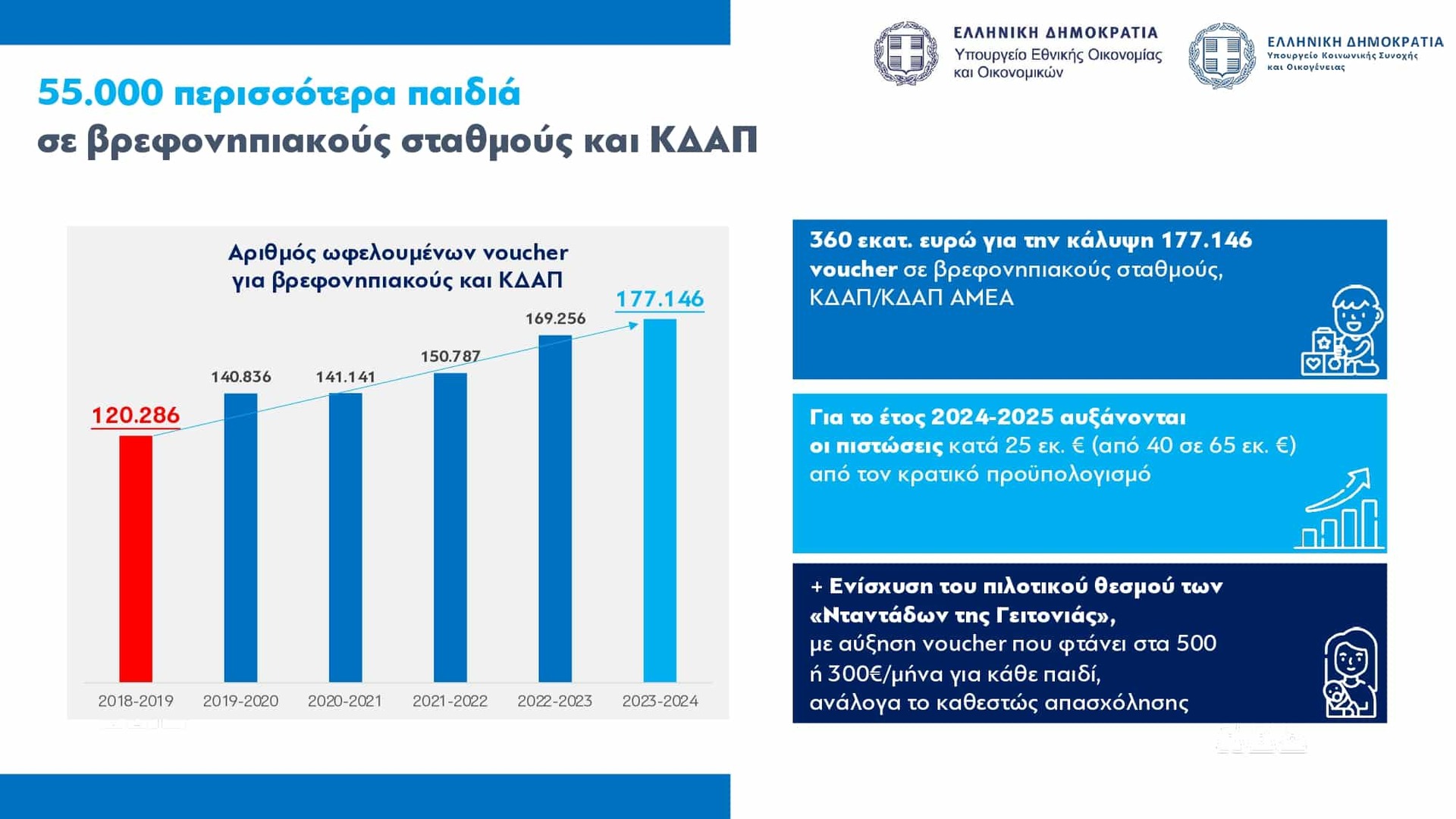 - Απονομή 360 εκατ. ευρώ για να καλυφθούν όλες οι πλήρεις αιτήσεις για voucher σε βρεφονηπιακούς σταθμούς (56.815). Στην περίοδο 2023-24, έλαβαν voucher 7.045 περισσότερα παιδιά για να εγγραφούν σε ΚΔΑΠ τυπικής ανάπτυξης και 1.305 περισσότερα παιδιά ΑμεΑ για να εγγραφούν σε ΚΔΑΠΑμεΑ. Το 2023-2024 αυξάνονται οι πιστώσεις κατά 25 εκατ. € (από 40 εκατ. € σε 65 εκατ. €) από τον κρατικό προϋπολογισμό.