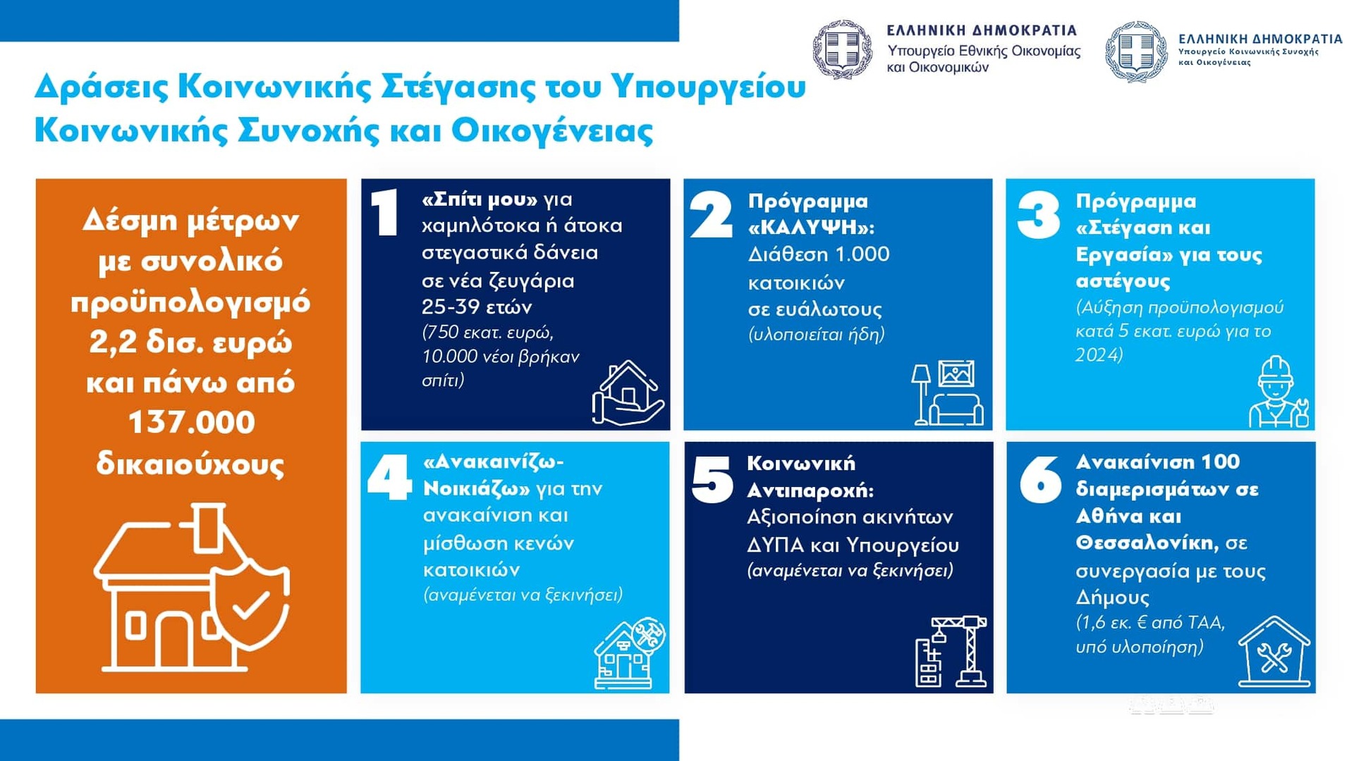 - Εφαρμογή δέσμης μέτρων για τη στεγαστική πολιτική με συνολικό προϋπολογισμό 2,2 δισ. ευρώ, μέσα από προγράμματα, που υλοποιούνται ήδη όπως: «Σπίτι μου» και «Κάλυψη» «Στέγαση και εργασία» και νέα που αναμένεται να ξεκινήσουν, όπως: «Ανακαινίζω Νοικιάζω» και «Κοινωνική Αντιπαροχή». Επιπρόσθετα, για το 2024 αυξάνεται ο προϋπολογισμός για το επίδομα στέγασης κατά 4 εκατ. € (από 396 σε 400 εκατ. ευρώ), καθώς και ο προϋπολογισμός για το πρόγραμμα «Στέγαση και Εργασία» κατά 5 εκατ. ευρώ.