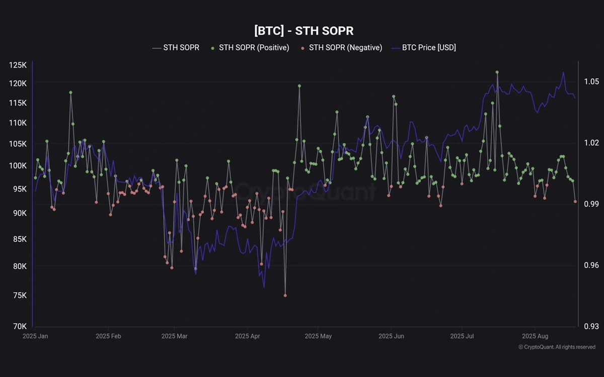 Σύμφωνα με τα δεδομένα, το SOPR (Spent Output Profit Ratio) των βραχυπρόθεσμων κατόχων, βρέθηκε κάτω από το 1 για πρώτη φορά έπειτα από δύο εβδομάδες. Αυτό σημαίνει ότι οι επενδυτές που είχαν αγοράσει σε επίπεδα πάνω από τις 117.000$ αποφάσισαν να πουλήσουν χαμηλότερα, ουσιαστικά ρευστοποιώντας σε ζημία. Το φαινόμενο δεν είναι καινούργιο. Στις αρχές Αυγούστου, μια παρόμοια διόρθωση είχε οδηγήσει το SOPR στο 0,99 όμως η αγορά βρήκε γρήγορα στηρίγματα και το BTC αντέδρασε ανοδικά, φτάνοντας τελικά στο ιστορικό υψηλό των 124.000$. Το ερώτημα είναι αν θα συμβεί το ίδιο και τώρα.
