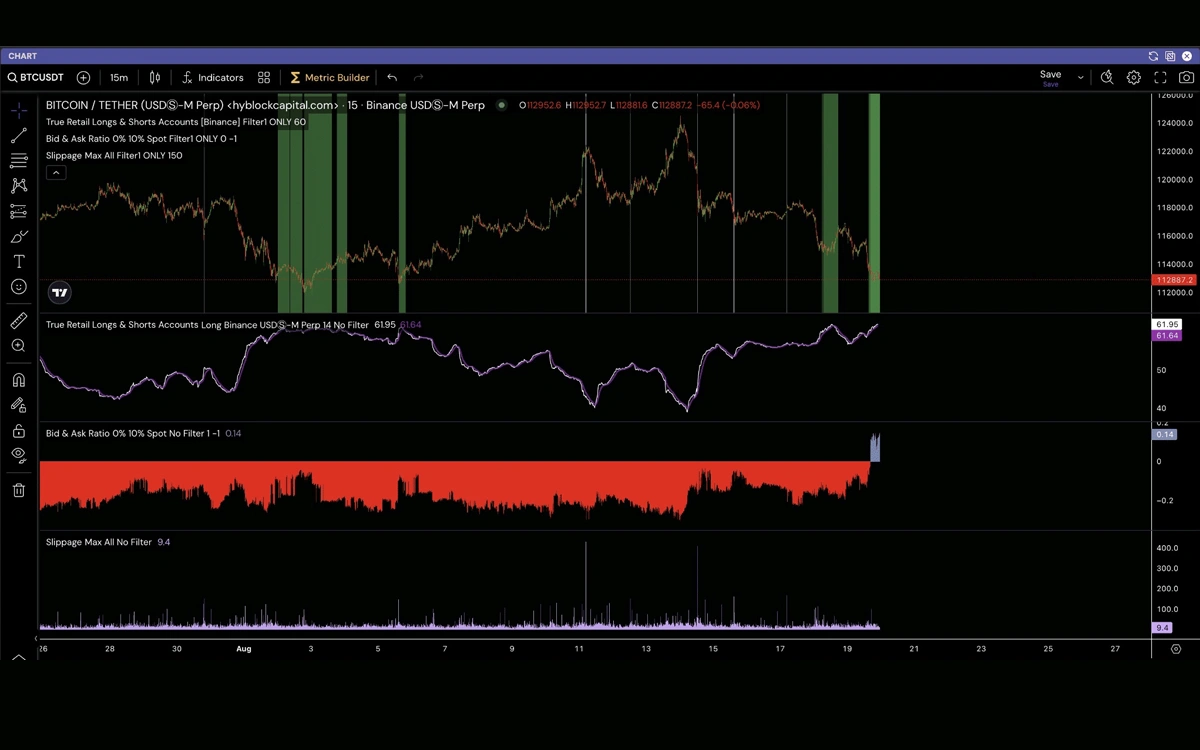 Τα στοιχεία από τα παράγωγα δείχνουν ότι το κοινό παραμένει αρκετά αισιόδοξο, με το ποσοστό των long θέσεων να κινείται στο 61–62%. Ωστόσο, αυτή η υπερβολική τοποθέτηση μπορεί να αποδειχθεί παγίδα, καθώς εάν συνεχιστεί η διόρθωση, ενδέχεται να οδηγήσει σε μαζικές ρευστοποιήσεις και περαιτέρω πίεση στις τιμές. Η ισορροπία Bid/Ask παραμένει χαμηλή, ενώ η ολίσθηση (slippage) σε υψηλά επίπεδα δείχνει ότι η αγορά είναι ευάλωτη σε απότομες κινήσεις.