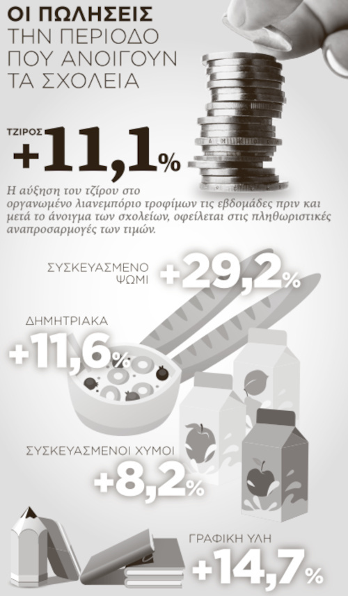 Σχετικά με τα προϊόντα που συνδέονται με το άνοιγμα των σχολείων, τη μεγαλύτερη ανάπτυξη, και μάλιστα σε διψήφιο ποσοστό, εμφάνισαν το συσκευασμένο ψωμί (+29,2%), η γραφική ύλη (+14,7%), τα δημητριακά (+11,6%) και οι συσκευασμένοι χυμοί (+8,2%).