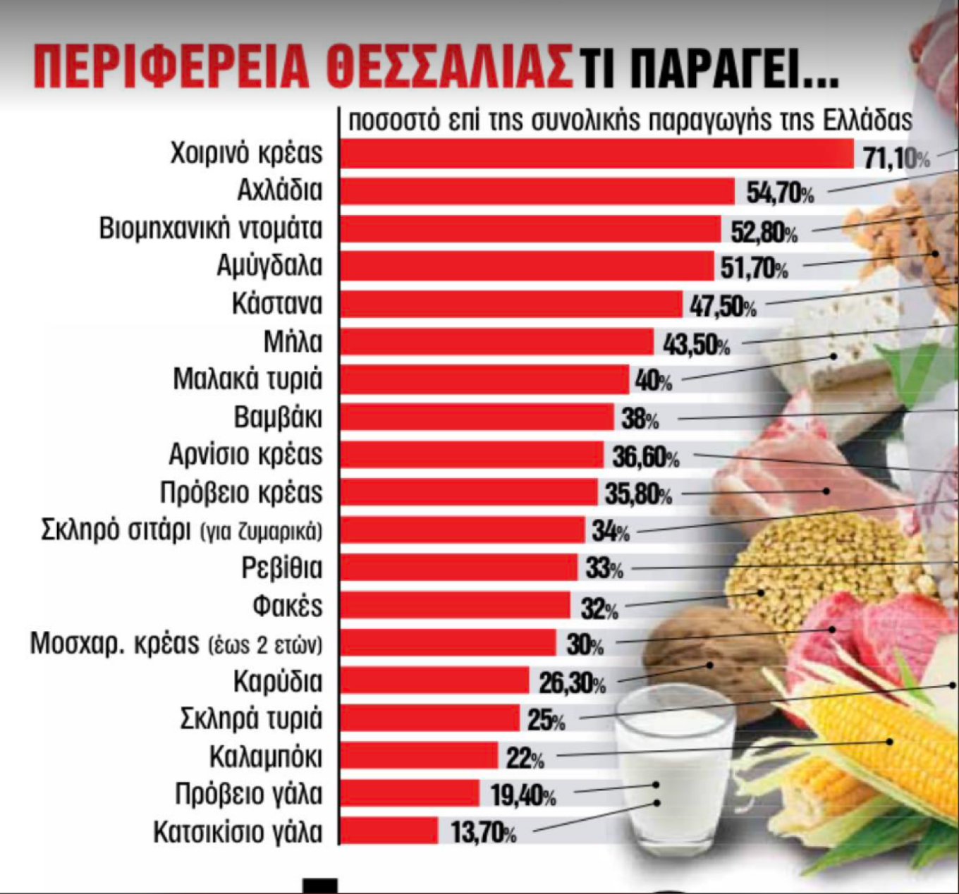 Σύμφωνα με στοιχεία της Ελληνικής Στατιστικής Αρχής η Περιφέρεια Θεσσαλίας τροφοδοτούσε την εγχώρια κατανάλωση με το 43,5% των μήλων, το 63% των αχλαδιών, το 34% του σκληρού σιταριού για την παραγωγή ζυμαρικών, το 18,3% του βόειου κρέατος, το 10%της εγχώριας παραγωγής αγελαδινού γάλακτος της χώρας το 22% του πρόβειου και το 16,49% του γίδινου γάλακτος. Τώρα η ζήτηση αυτή θα πρέπει να καλυφθεί ακόμα και από το εξωτερικό.