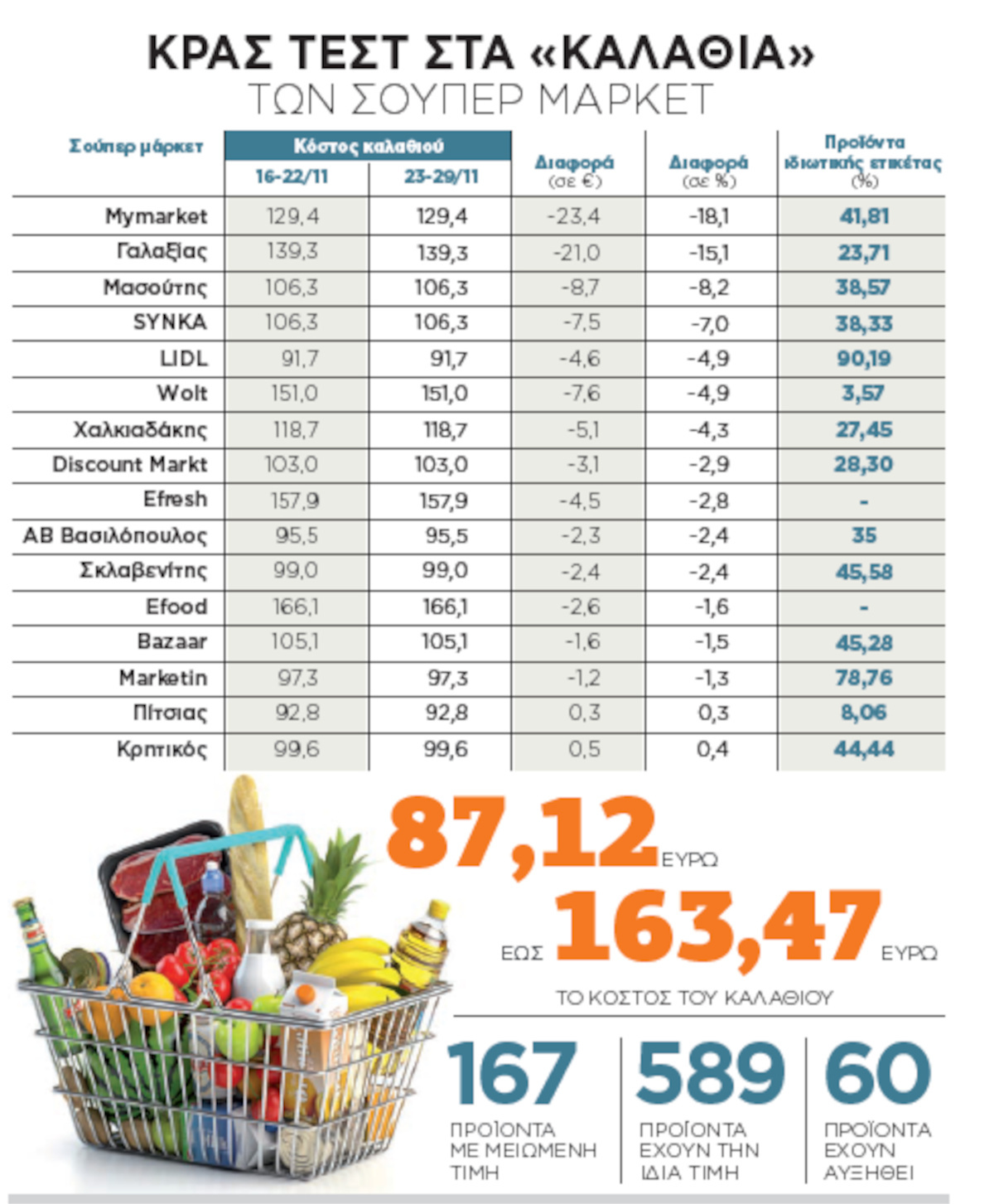 Το πιο οικονομικό «καλάθι» αυτή την εβδομάδα το έχει το Lidl, με κόστος 87,12 ευρώ, και ακολουθούν: Πίτσιας με 93,08 ευρώ, ΑΒ Βασιλόπουλος με 93,13 ευρώ, Market In με 96,06 ευρώ, Σκλαβενίτης με 96,58 ευρώ κ.ο.κ. Το πιο ακριβό «καλάθι», αντίστοιχα, παρουσιάστηκε από το efood με 163,47 ευρώ, ενώ έπονται efresh με 153,44 ευρώ, wolt με 143,59 ευρώ κ.λπ. Επιπλέον, τη μεγαλύτερη πτώση στις τιμές του «καλαθιού» του είχε το My Market, καθώς την τρέχουσα εβδομάδα είναι κατά 23,47 ευρώ πιο οικονομικό, ενώ τη μεγαλύτερη αύξηση την είχε ο Κρητικός με 0,44 ευρώ (0,44%) πιο ακριβό «καλάθι», σε σχέση με αυτό που παρουσίασε την περασμένη εβδομάδα. Μαζί με τον Πίτσια (0,25 ευρώ, 0,27%) ήταν και οι μόνες αλυσίδες, από τις 15 που συμμετέχουν στην πρωτοβουλία, που είχαν αύξηση, ελάχιστη ωστόσο, στο συνολικό κόστος του «καλαθιού» τους.